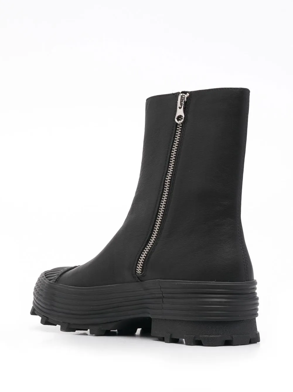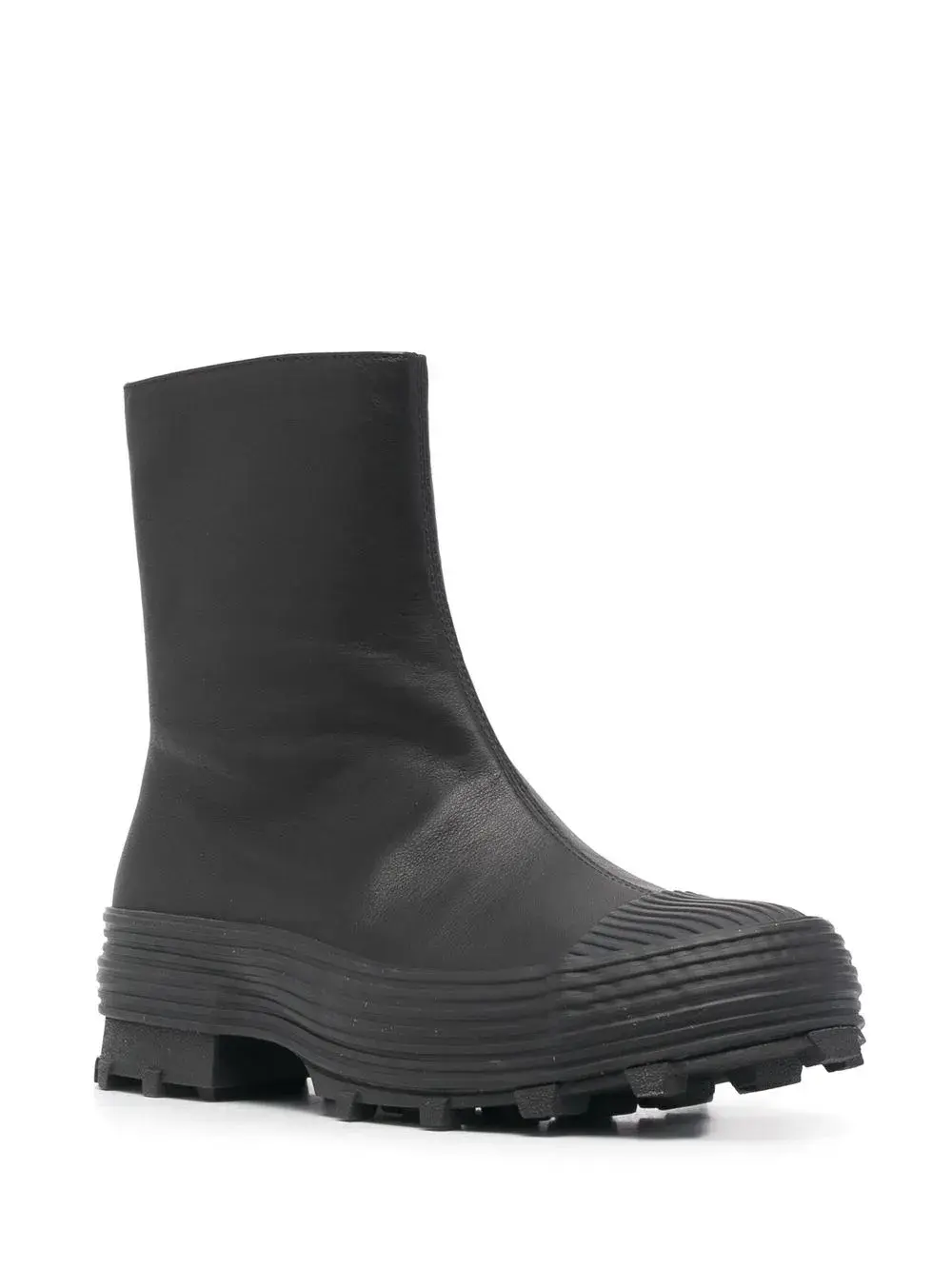 Черный, переработанный полиэстер, кожа, миндалевидный носок, резиновый носок, застежка на молнии сбоку, плоская резиновая подошва и длина по щиколотку.