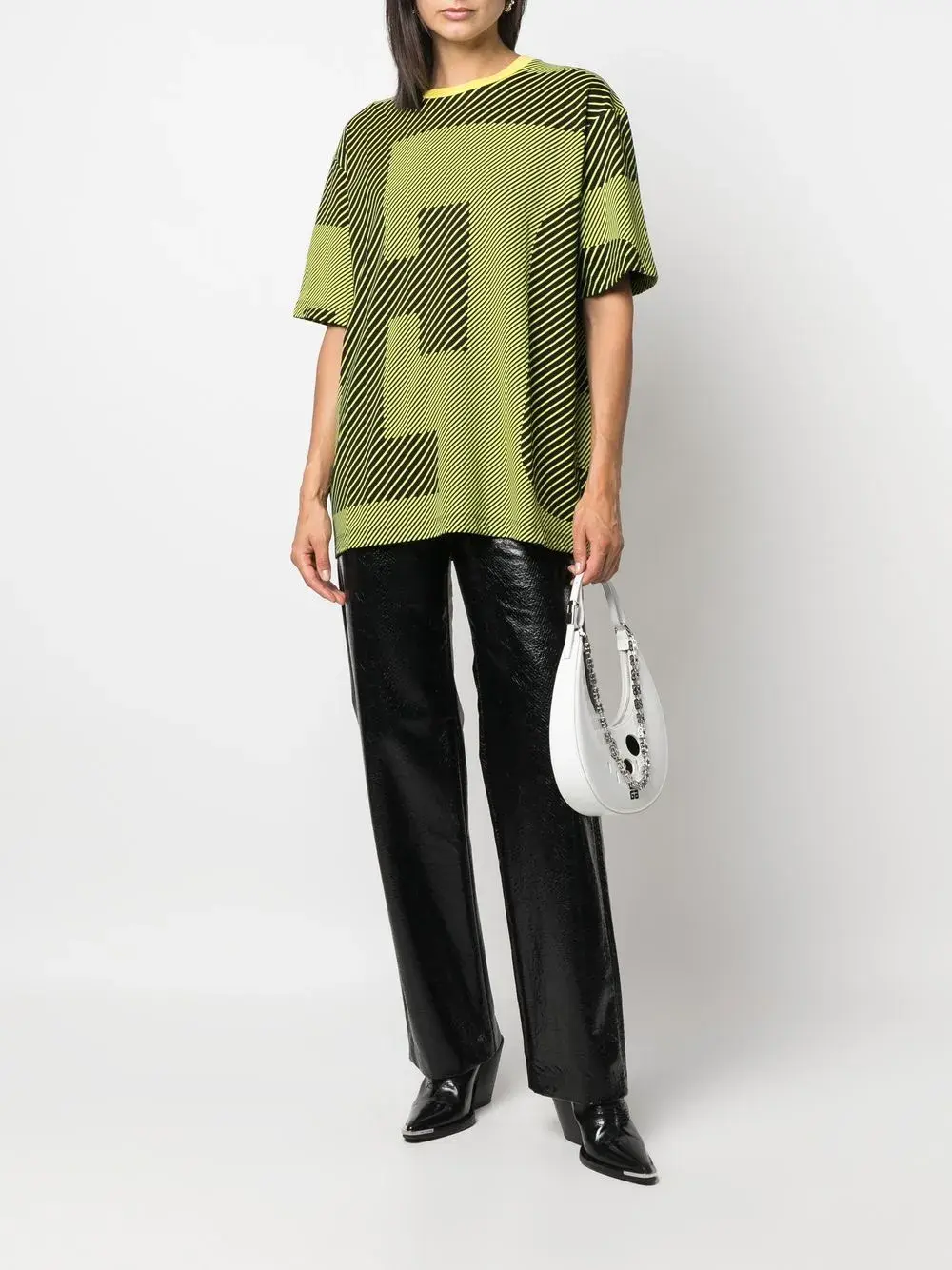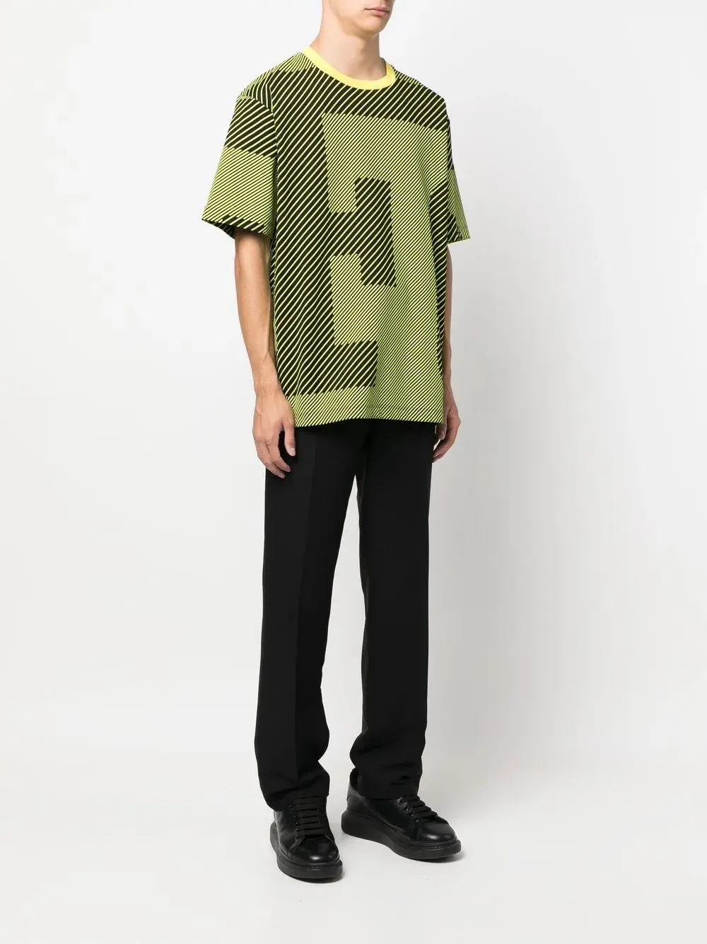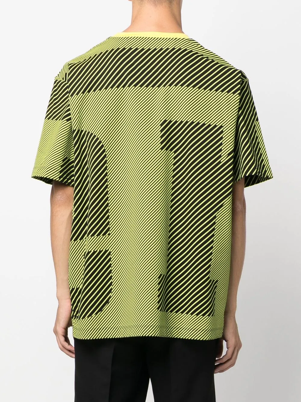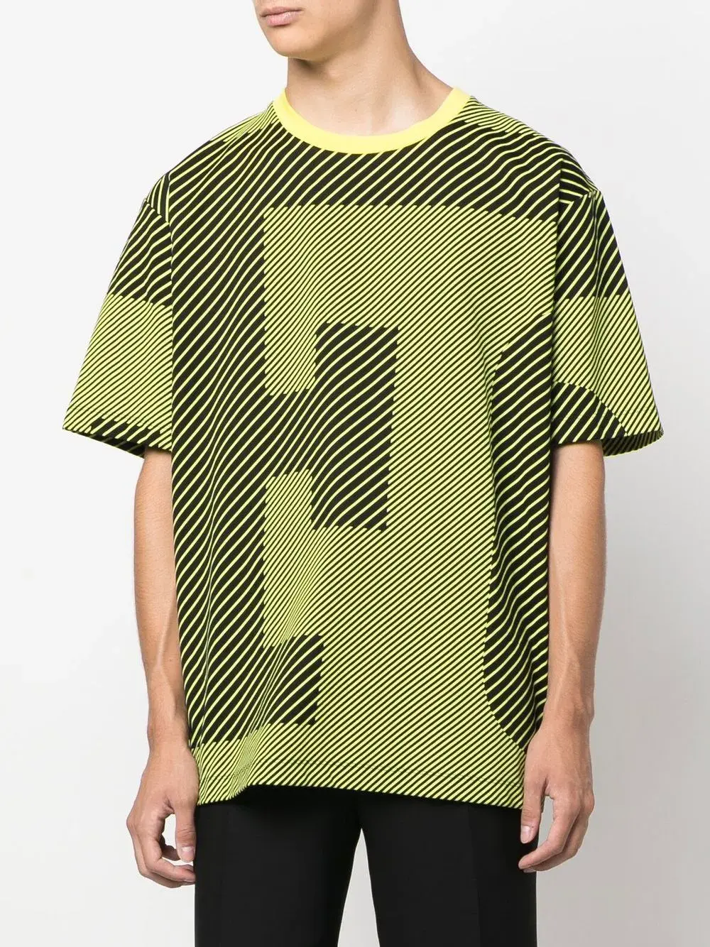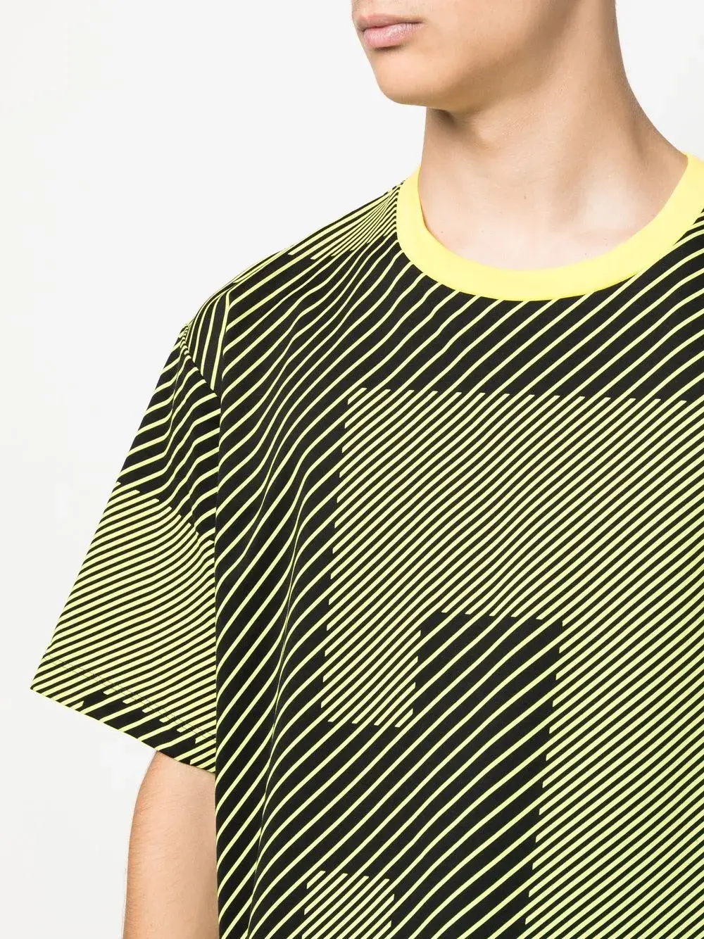 Желтый, черный, органический хлопок, ткань джерси, узор в полоску, сплошной принт с логотипом, голографичный эффект, круглый вырез, короткие рукава и прямой подол. Это унисекс-модель. Обратите внимание, что для нее используется мужская размерная сетка.