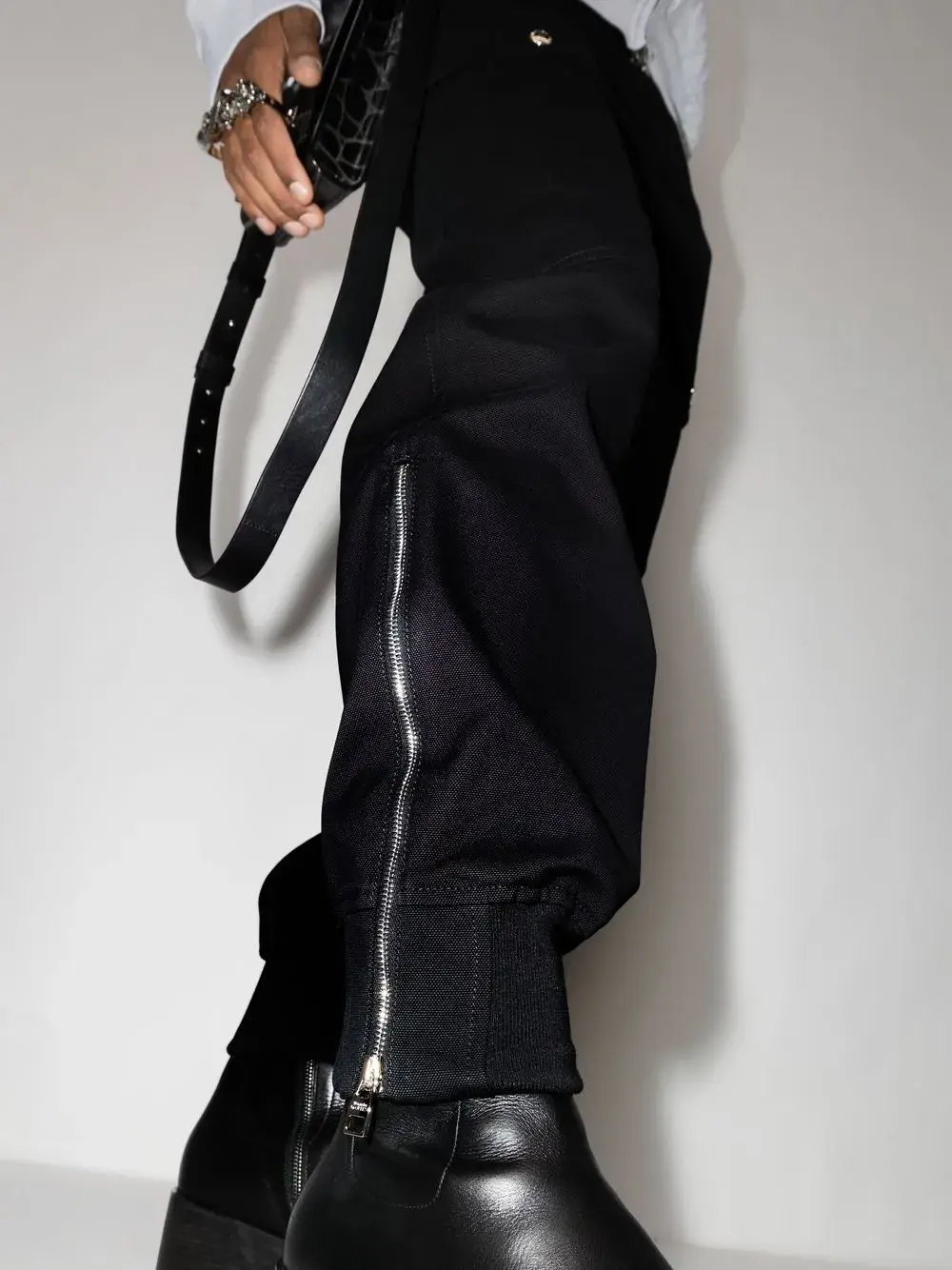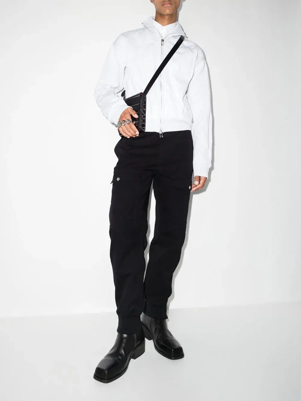 Черный, хлопок, накладные карманы, два прорезных кармана по бокам, потайная застежка на молнии и пуговицах, молнии на манжетах и манжеты в рубчик.