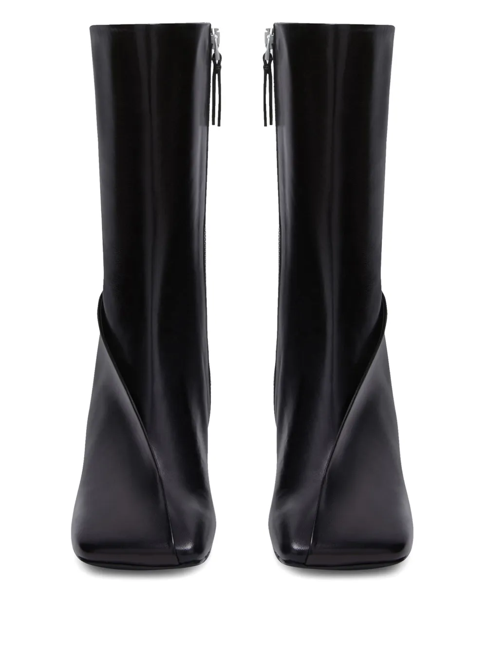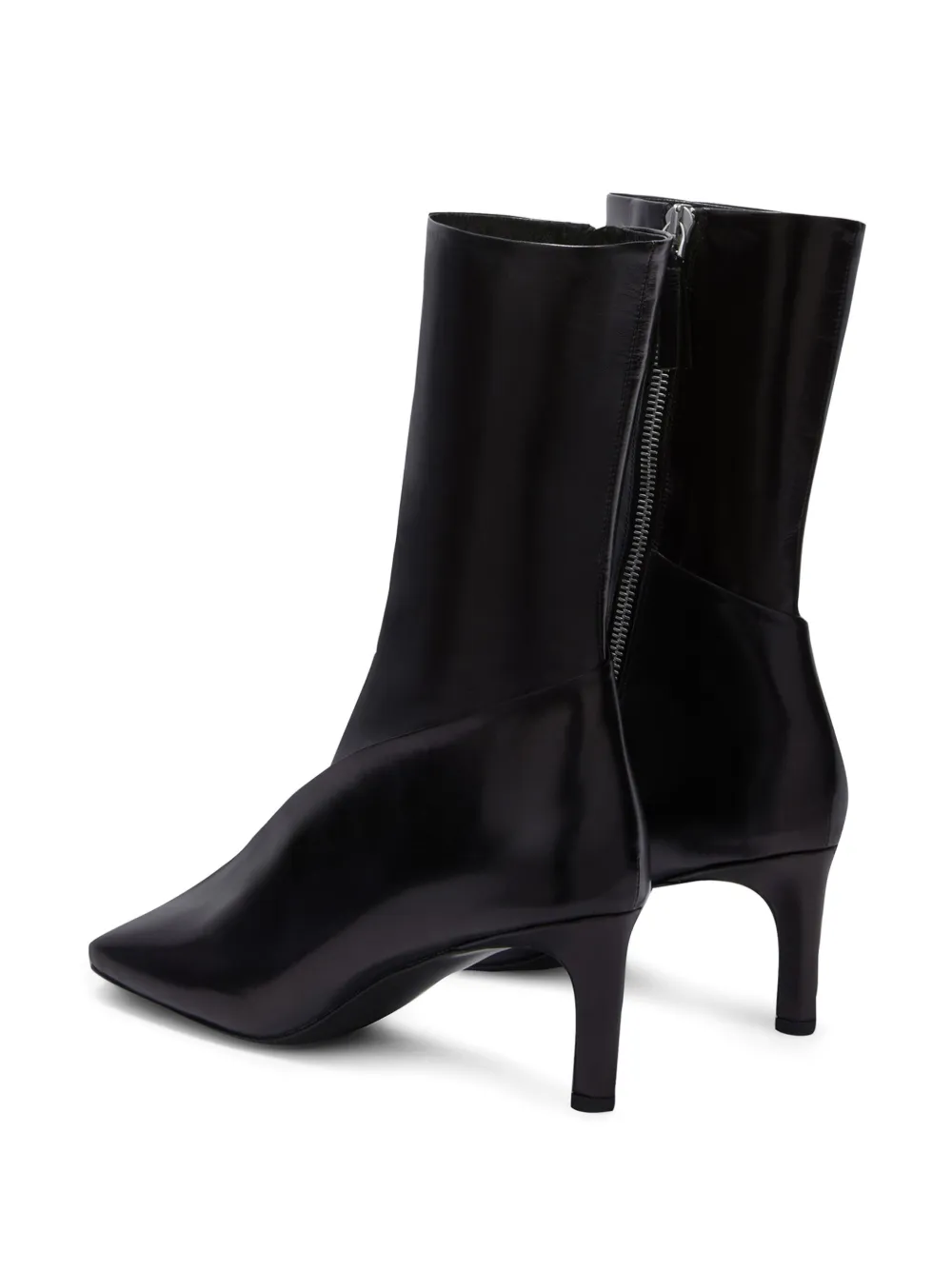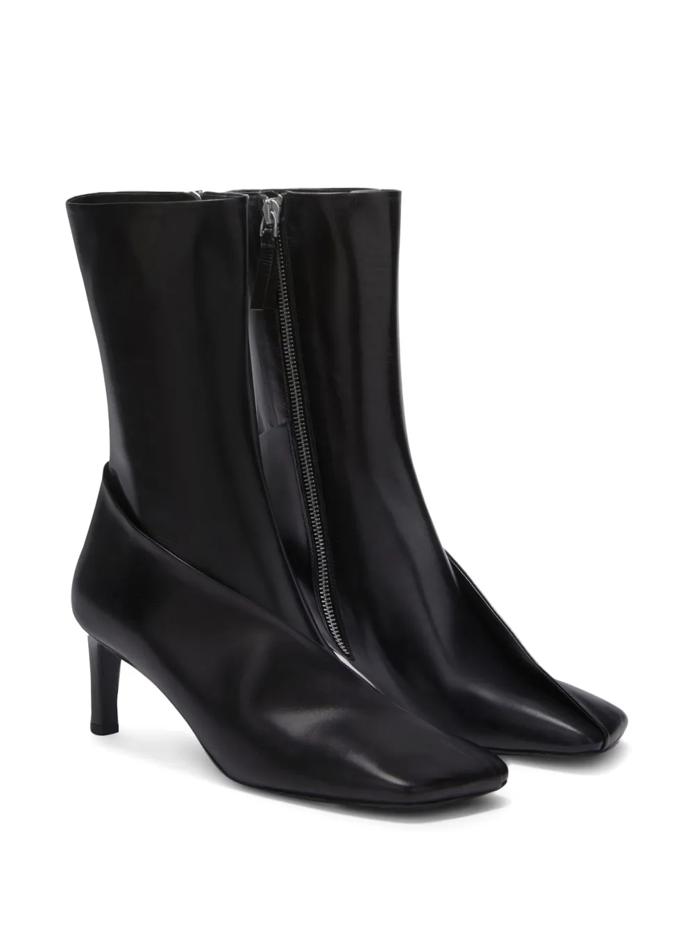 Черный, телячья кожа, квадратный носок, застежка на молнии сбоку, высота по щиколотку, кожаная стелька с логотипом и высокий каблук.