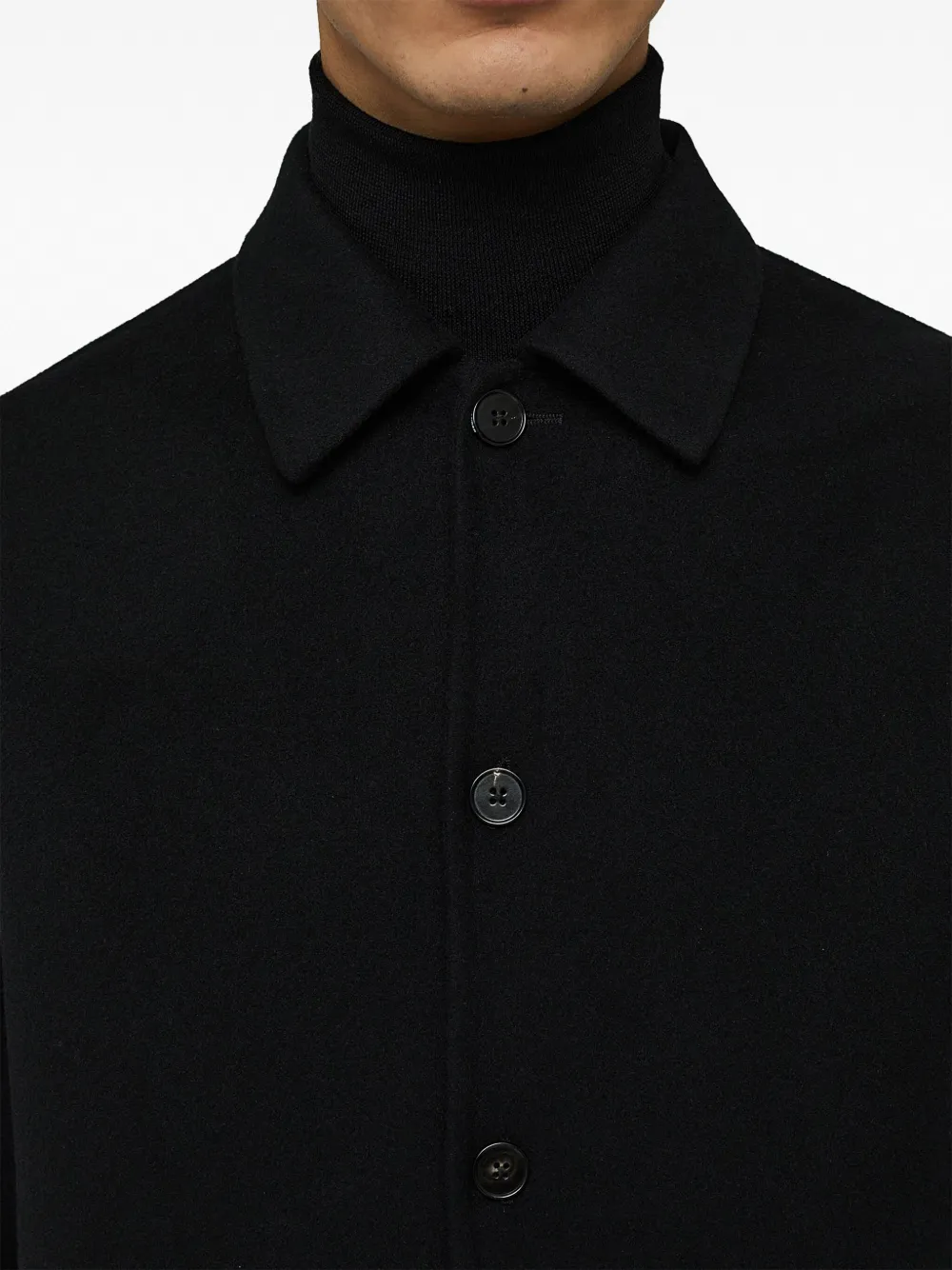 Черный, кашемир, классический воротник, застежка на пуговицах спереди, длинные рукава и закругленный подол.