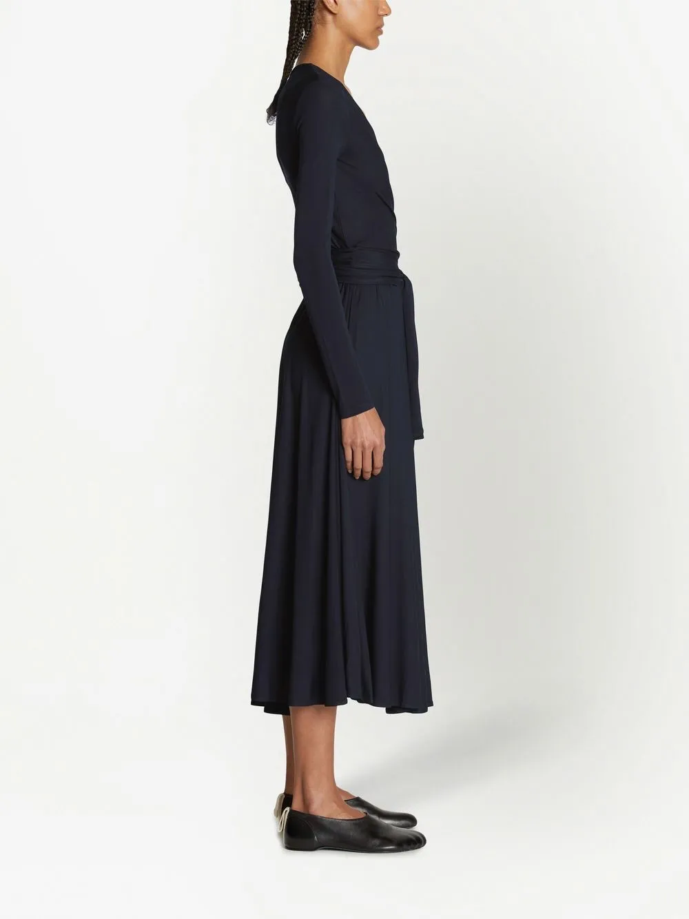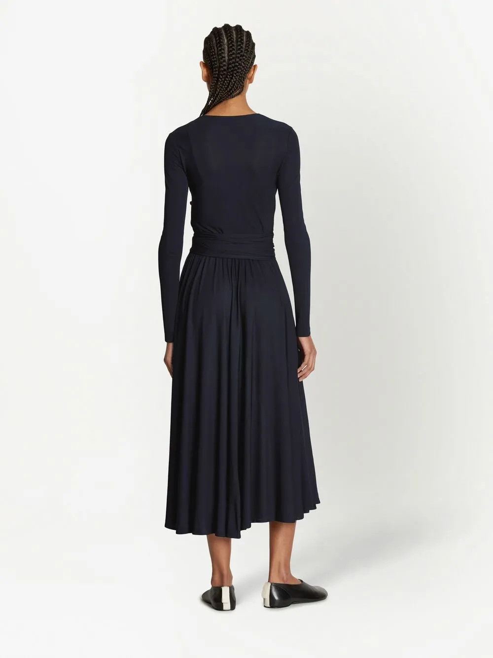 Декор в виде узла, дизайн со сборками, V-образный вырез, длинные рукава, расклешенный крой, длина миди и прямой подол.