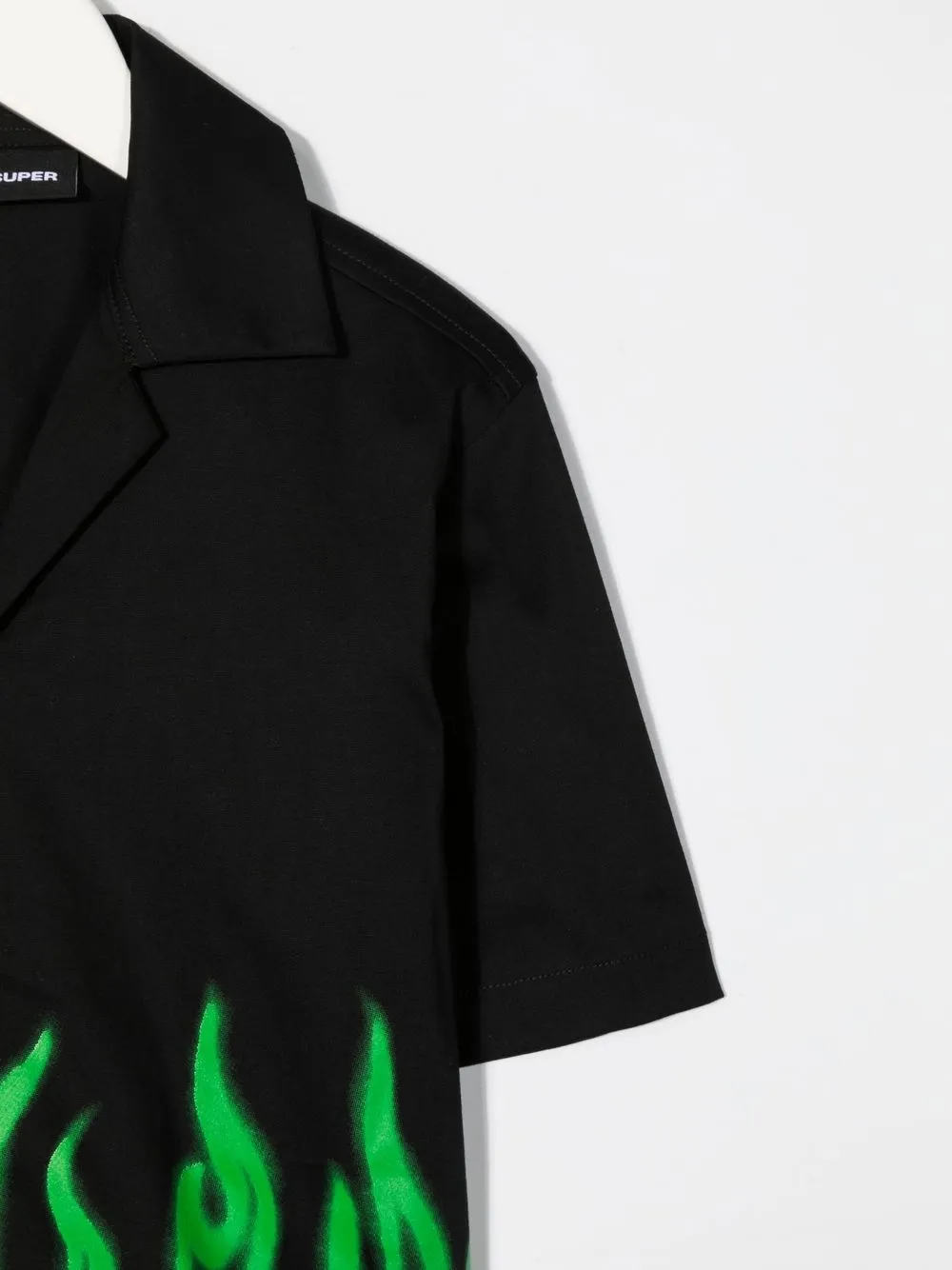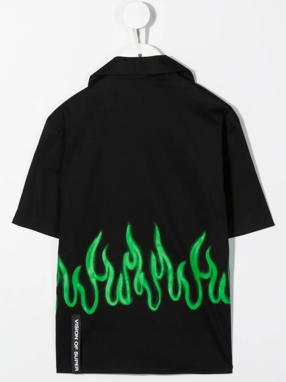 Черный, зеленый хлопок принт с изображением пламени нашивка с логотипом сзади зазубренный воротник застежка на пуговицах спереди короткие рукава прямой подол