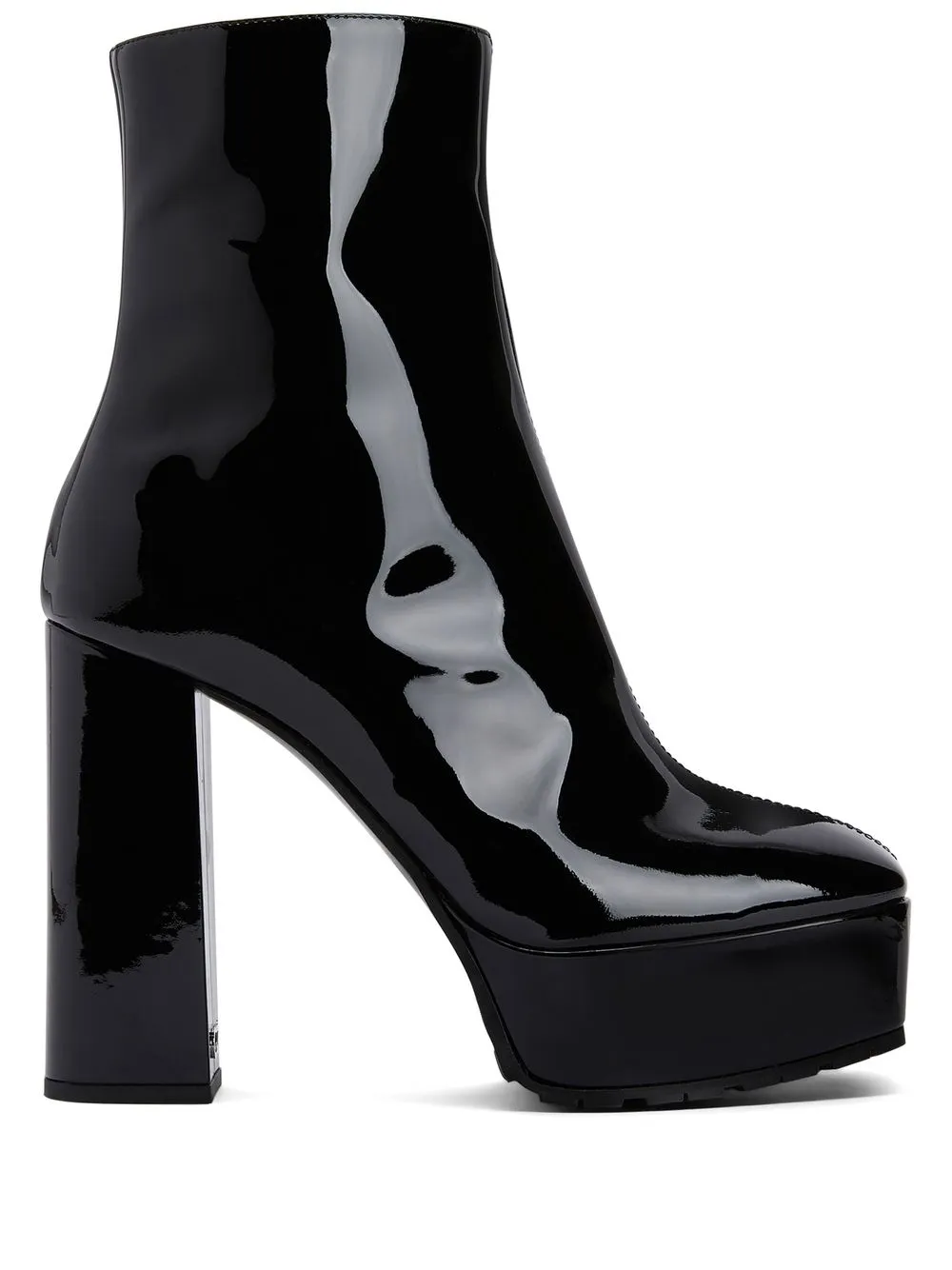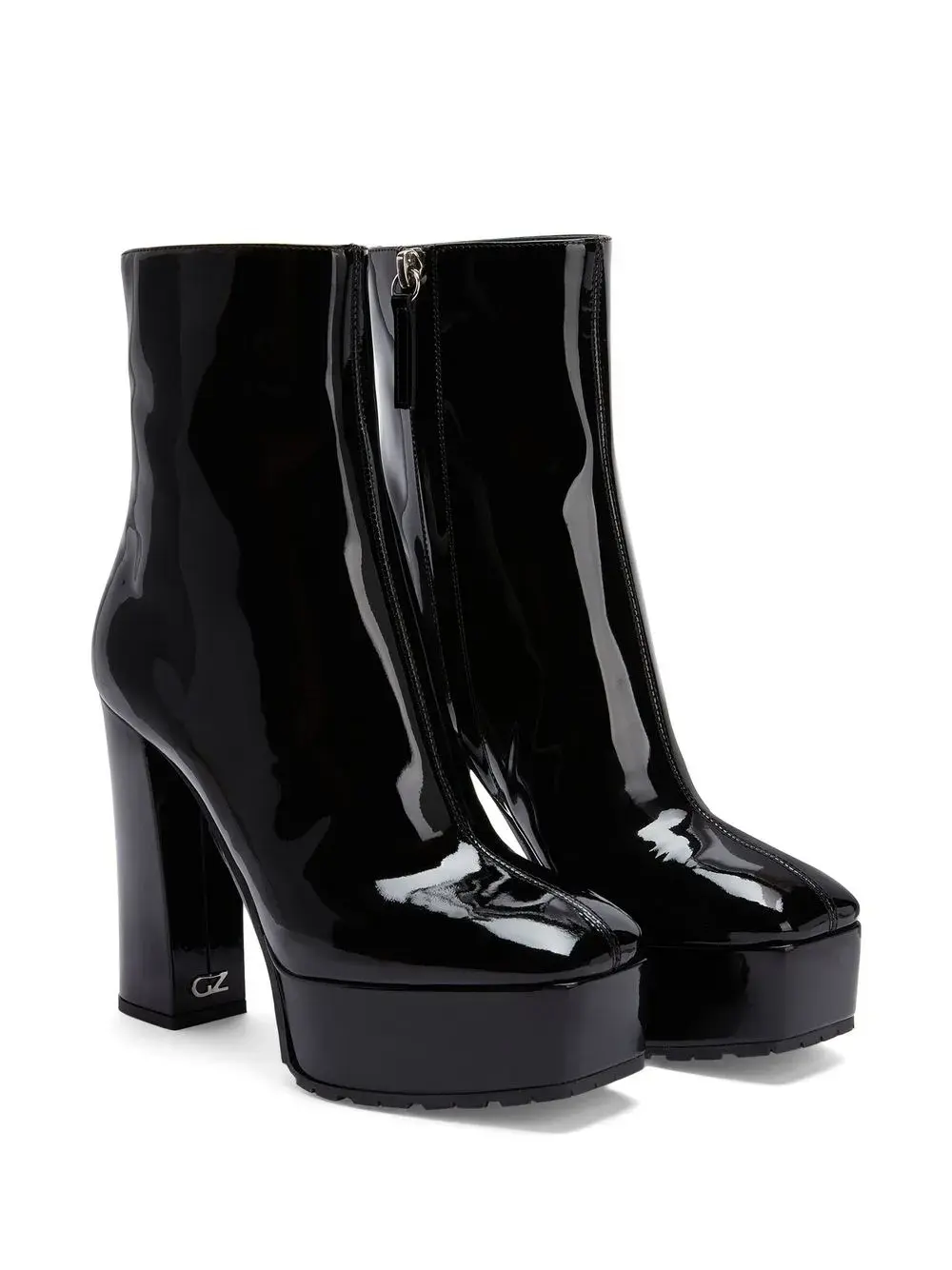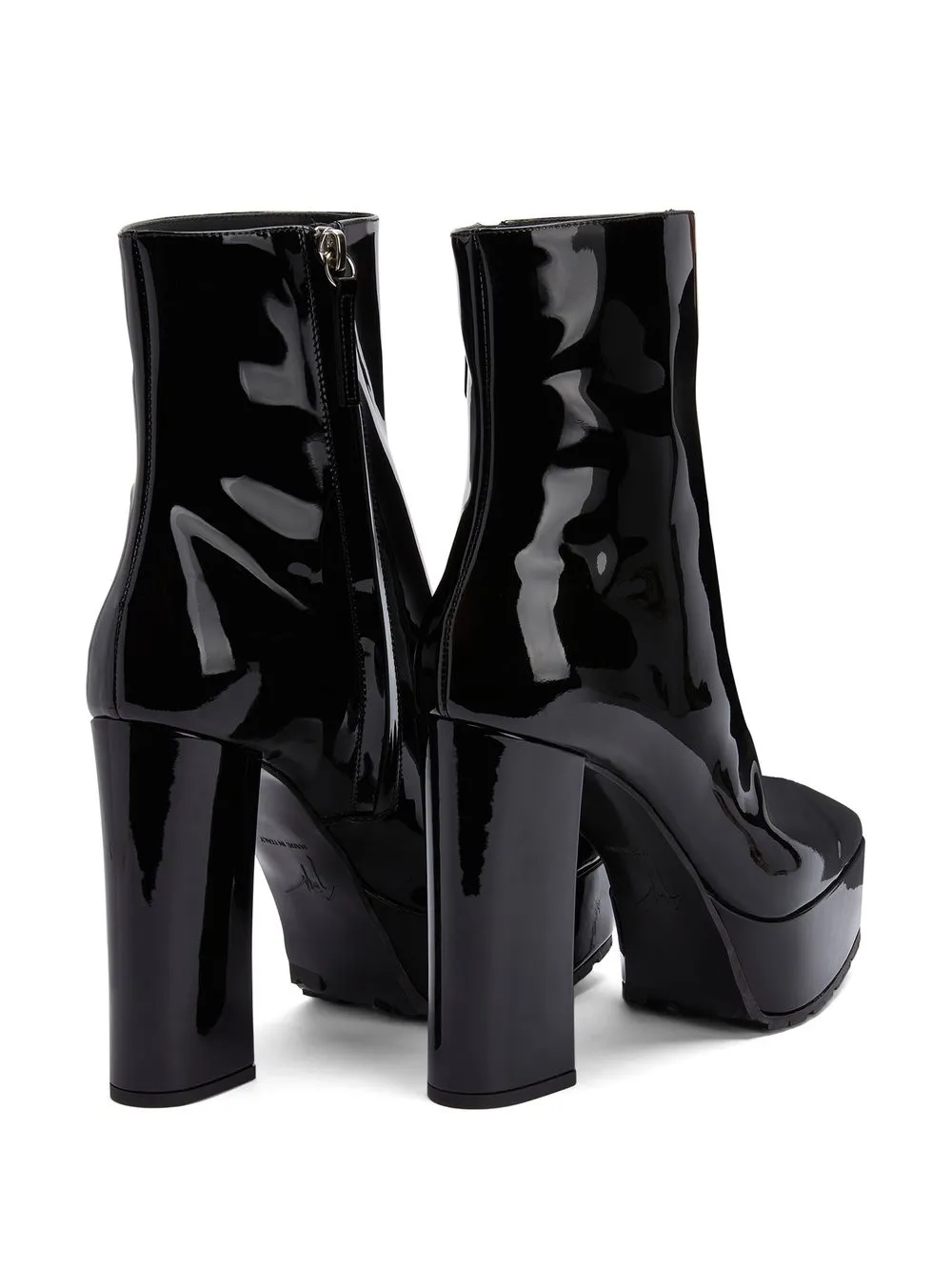 Черный, металл с покрытием, квадратный носок, высота по щиколотку, застежка на молнии сбоку и подошва на платформе.