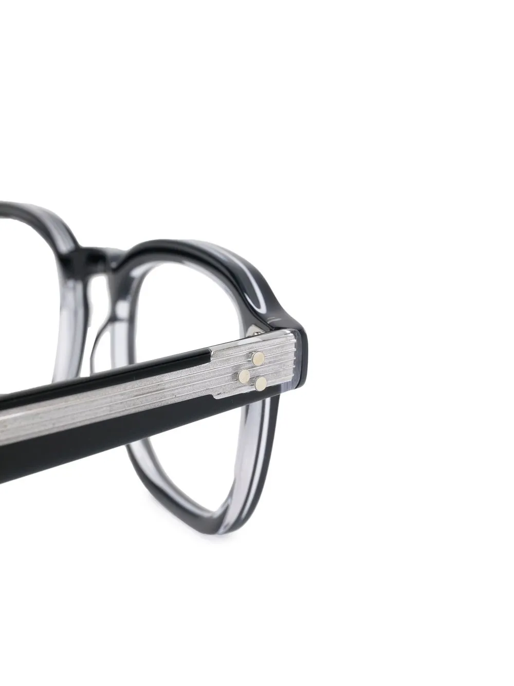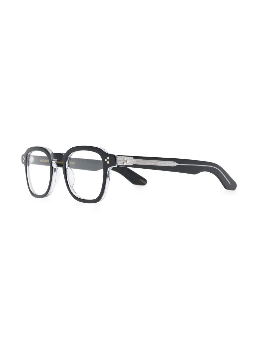 Квадратная оправа, прозрачные линзы, серебристая фурнитура и дужки с закругленными концами. Обратите внимание, что на FARFETCH продаются оправы с линзами без диоптрий.