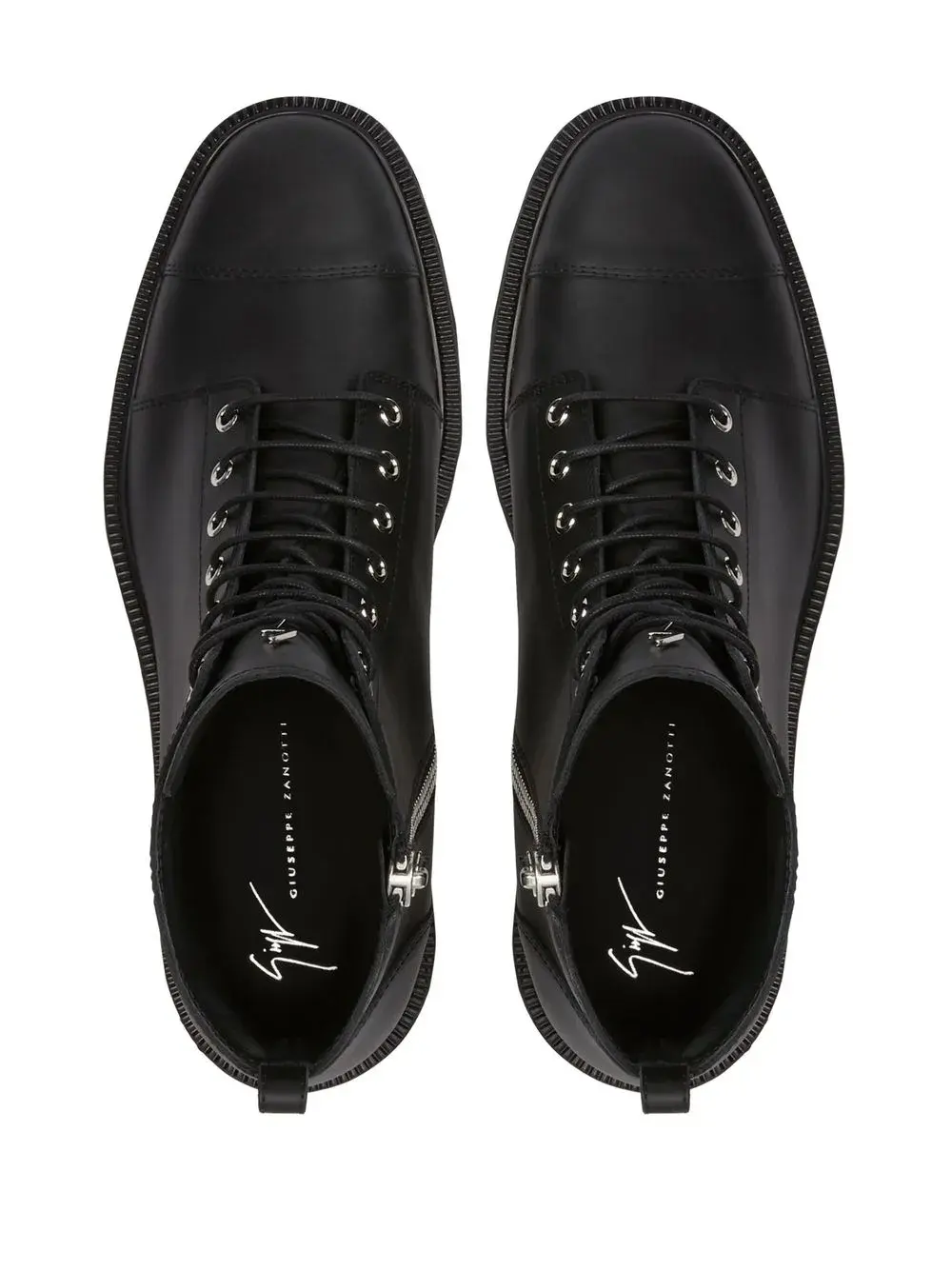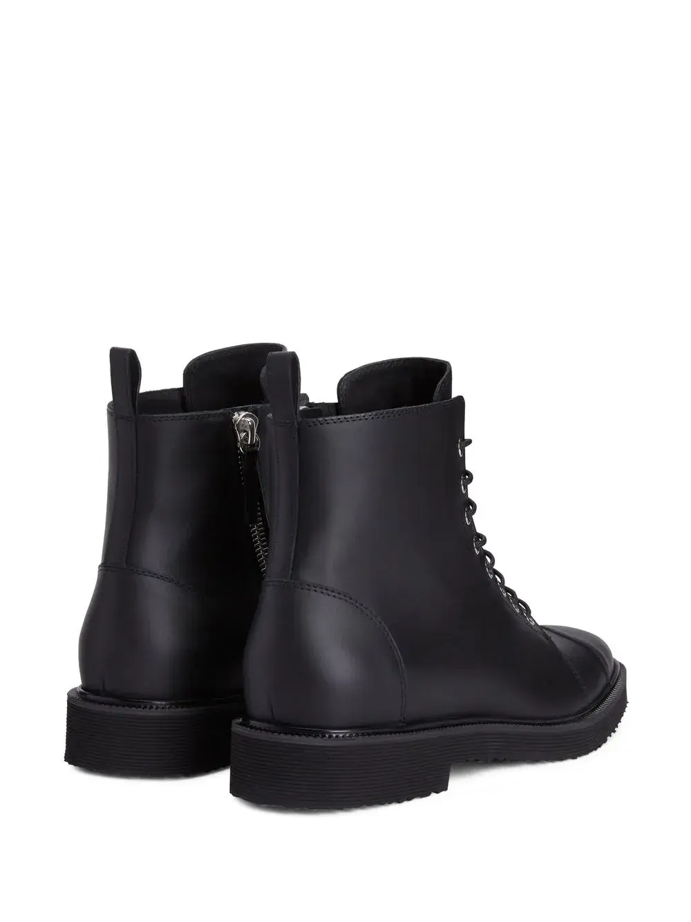 Черный, кожа, закругленный носок, шнуровка спереди, металлический логотип на язычке, высота по щиколотку, петля для подтягивания сзади и плоская резиновая подошва.