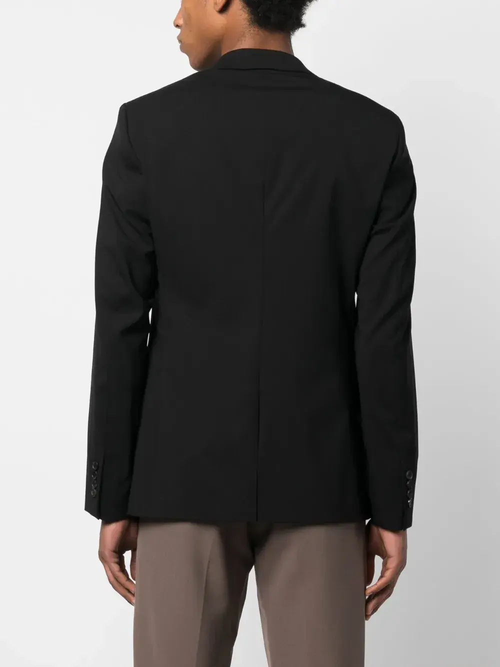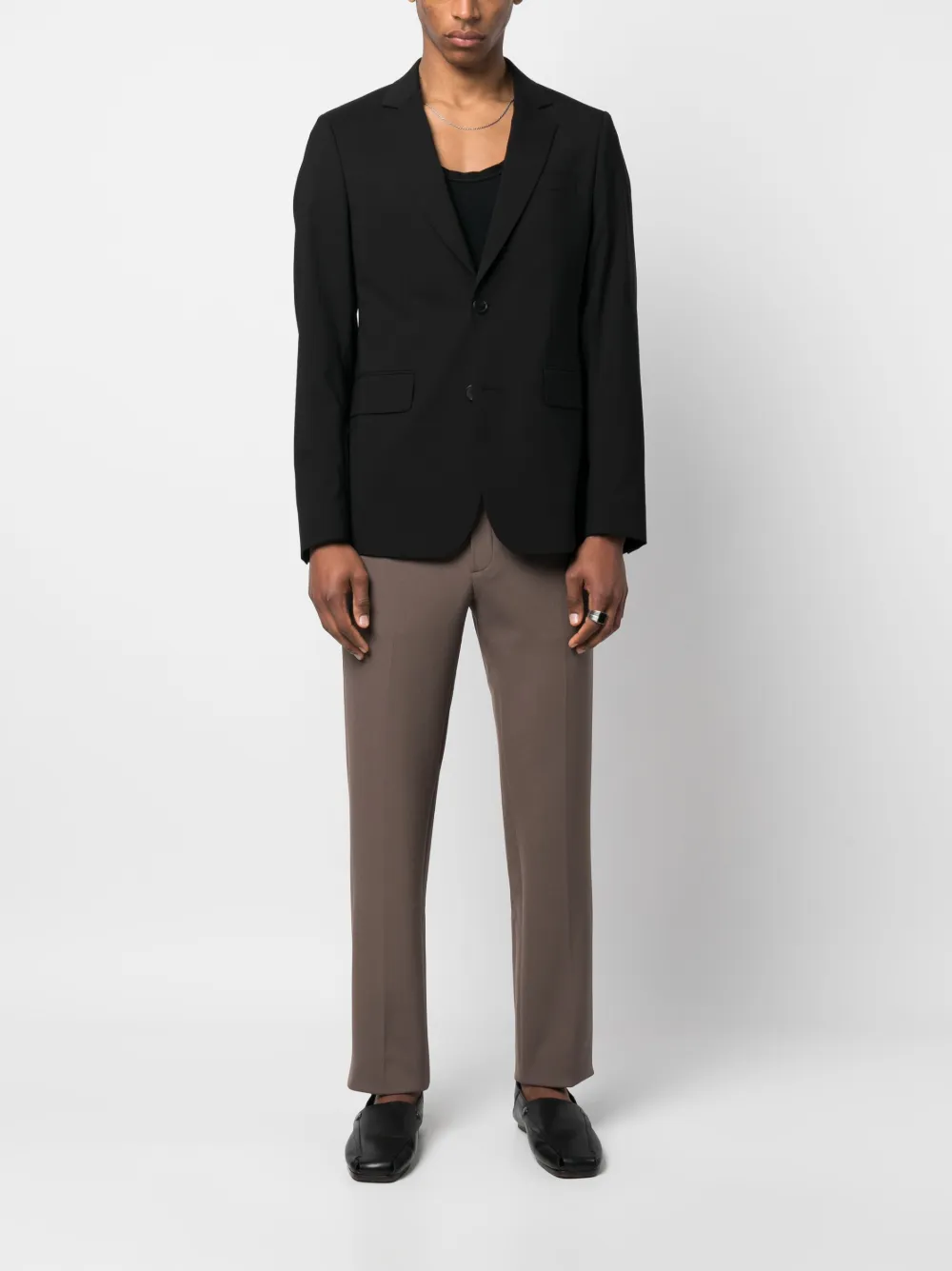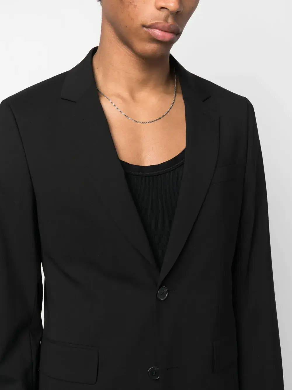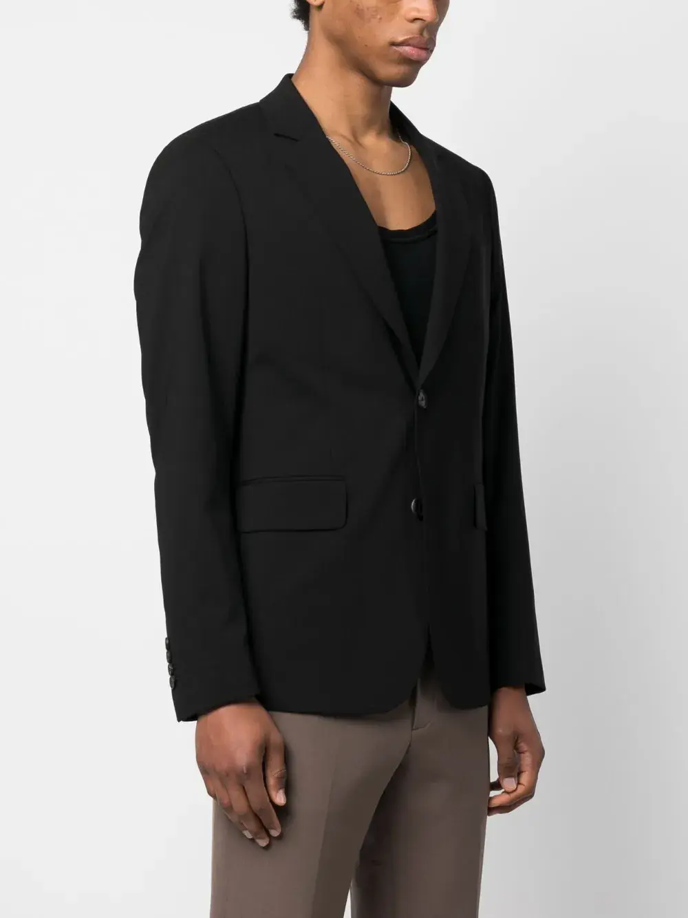 Черный, смесовая шерсть, зазубренные лацканы, длинные рукава и два накладных кармана спереди.