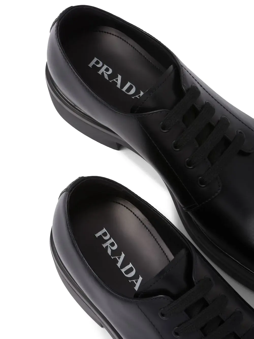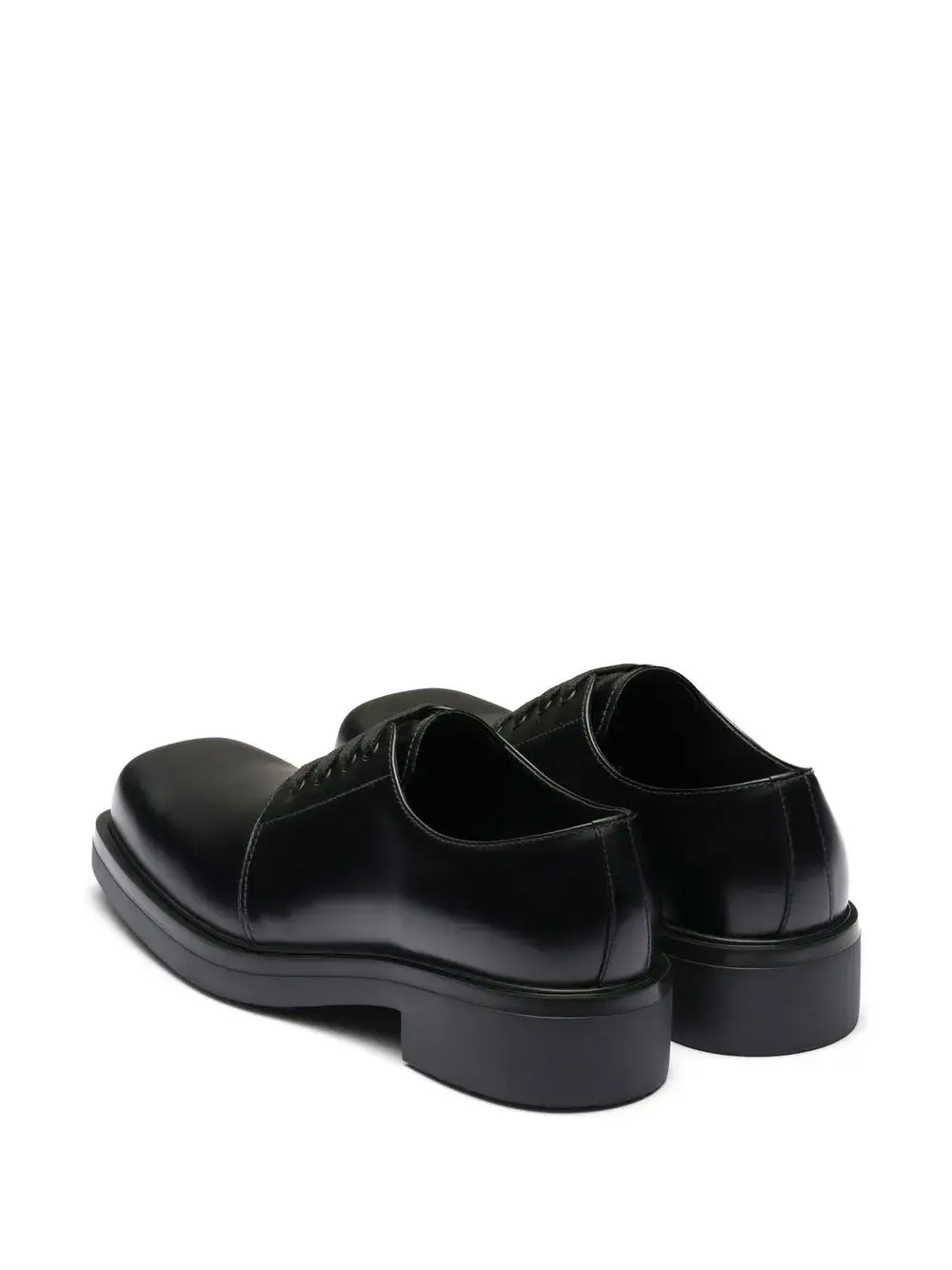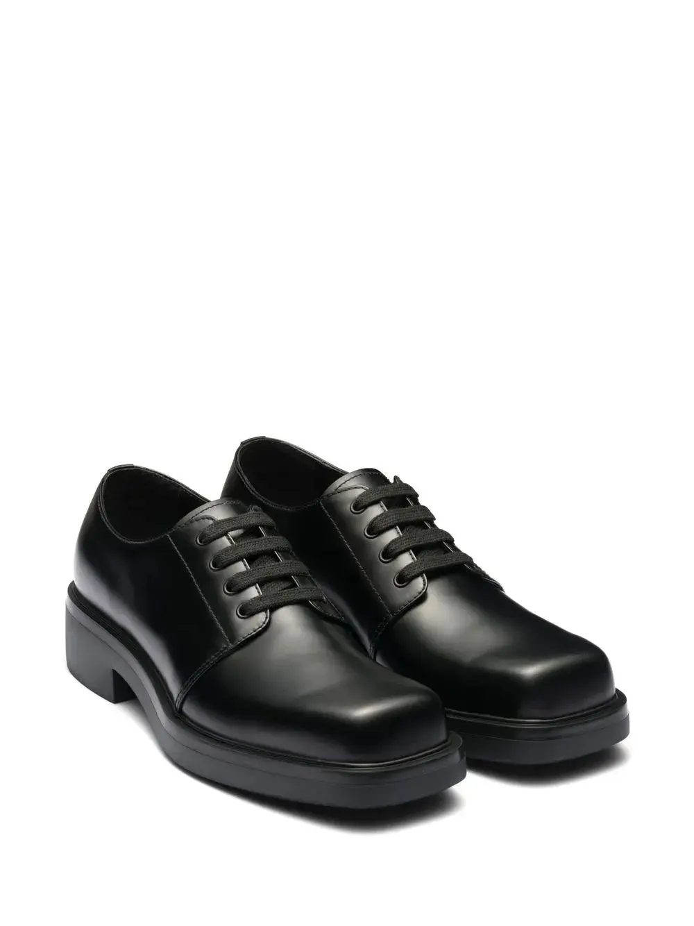 Черный, Кожа, квадратный носок, шнуровка спереди, низкий каблук и стелька с логотипом.