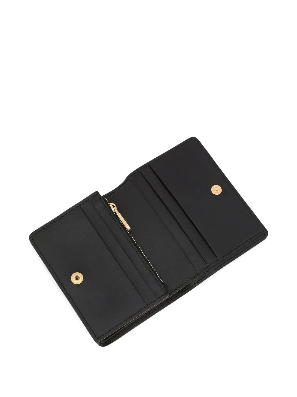 Черный, телячья кожа, золотистый металлический логотип, два сложения, потайная застежка на кнопках, внутренние отделения для карт, внутренний карман на молнии и отделение для купюр.