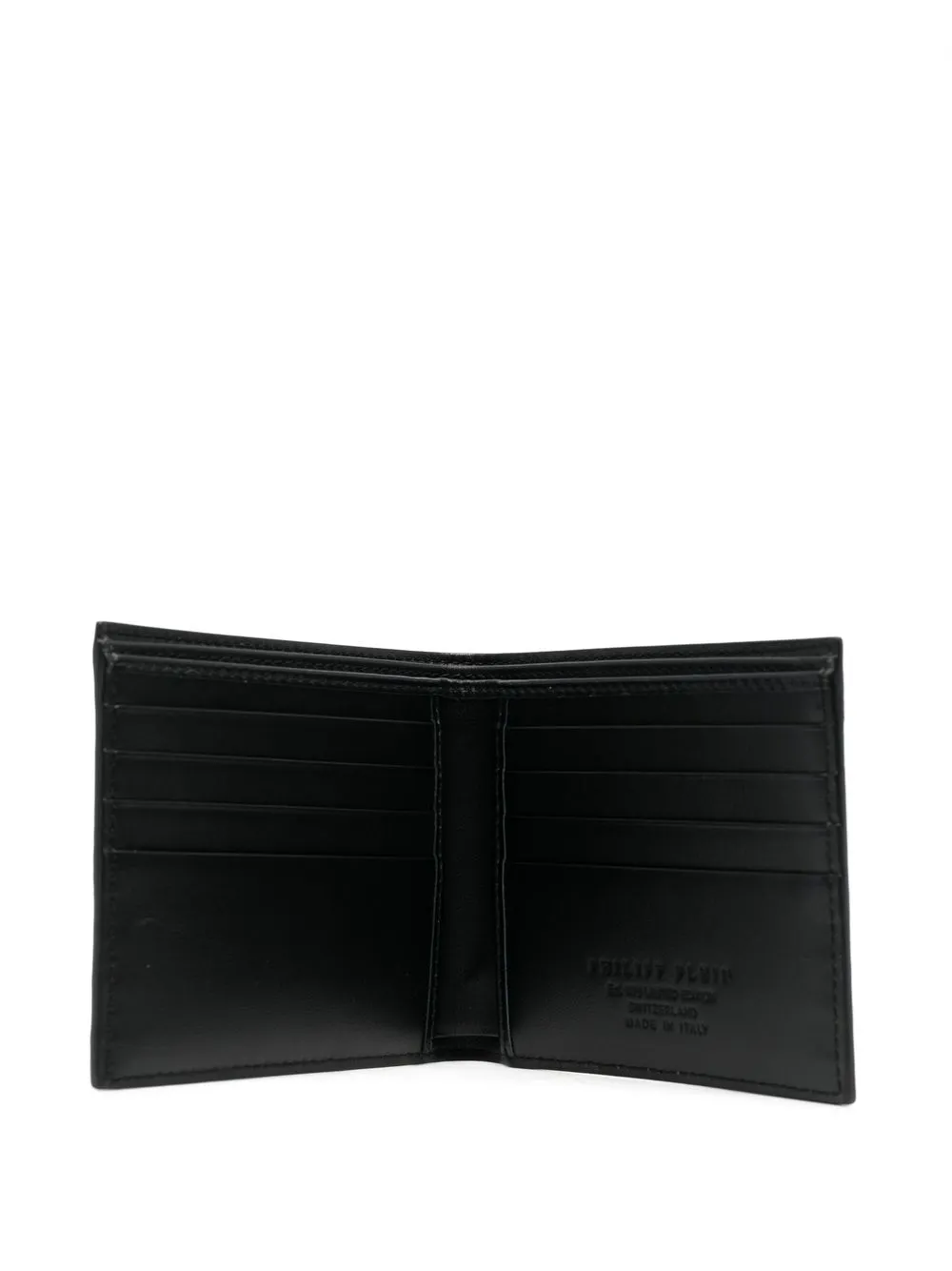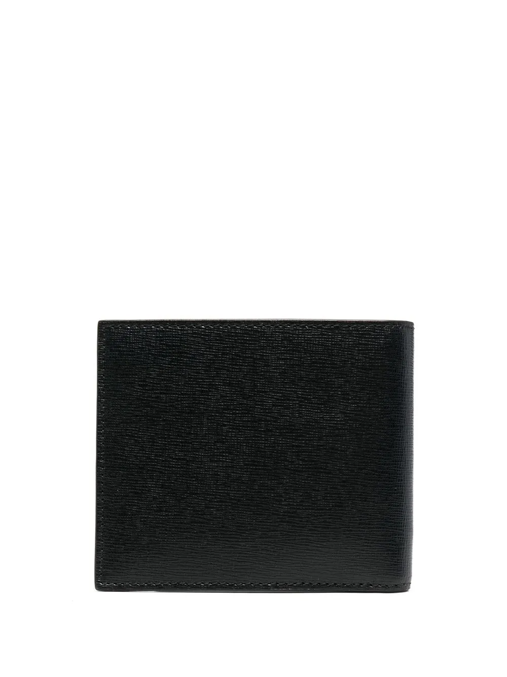 Черный, кожа, зернистая текстура, золотистый логотип и внутренние отделения для карт.