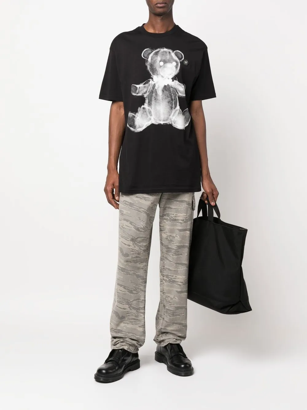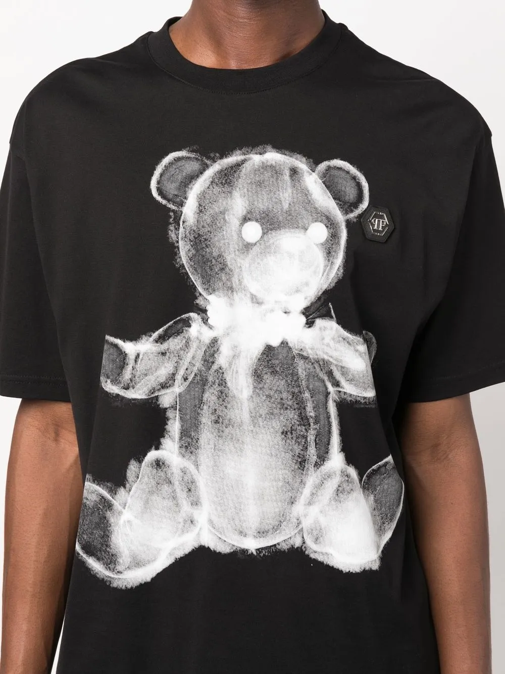 Черный/белый, хлопок, принт с изображением плюшевого медведя, круглый вырез, короткие рукава и прямой подол.