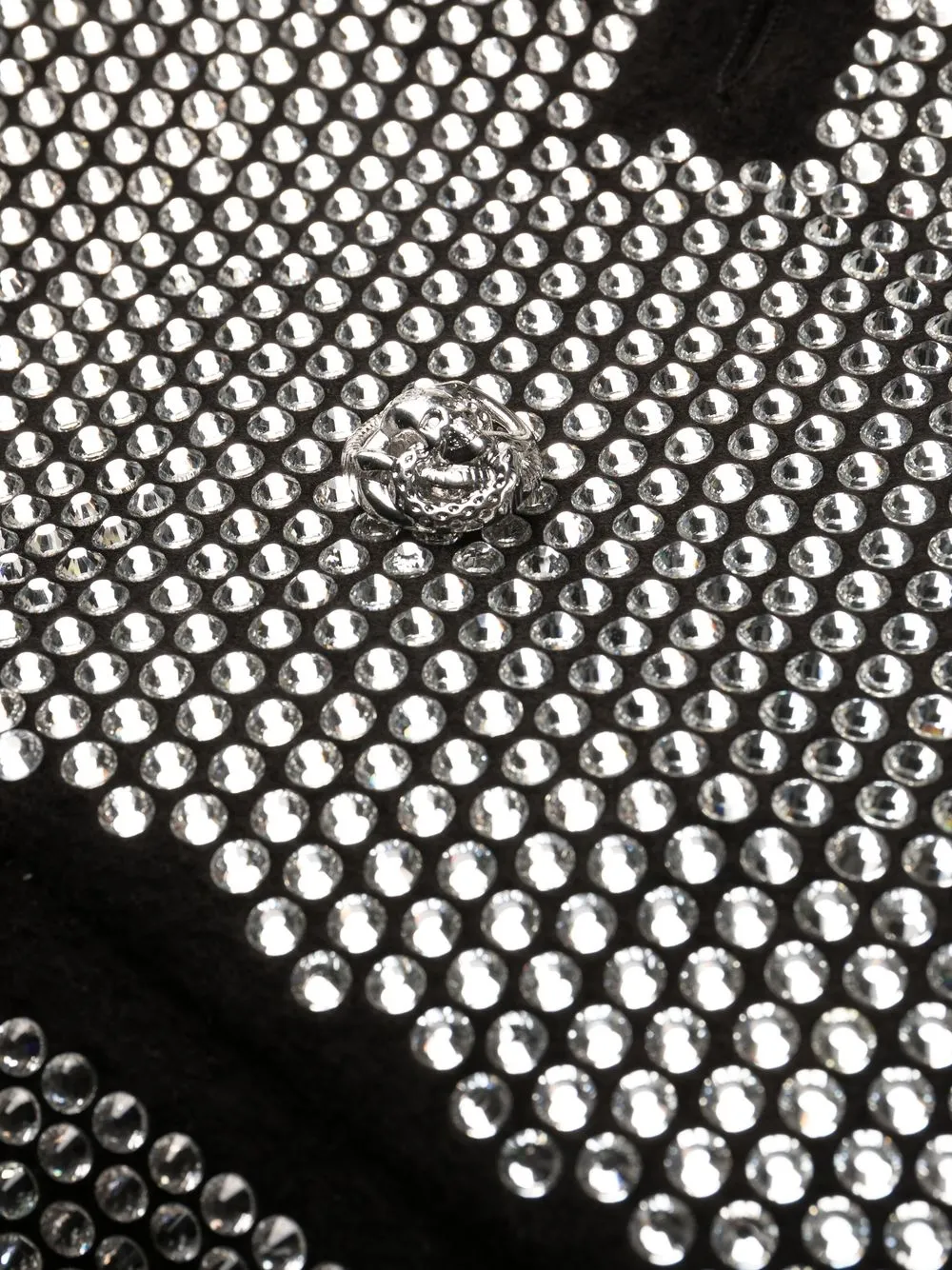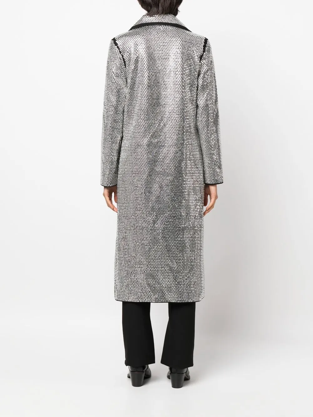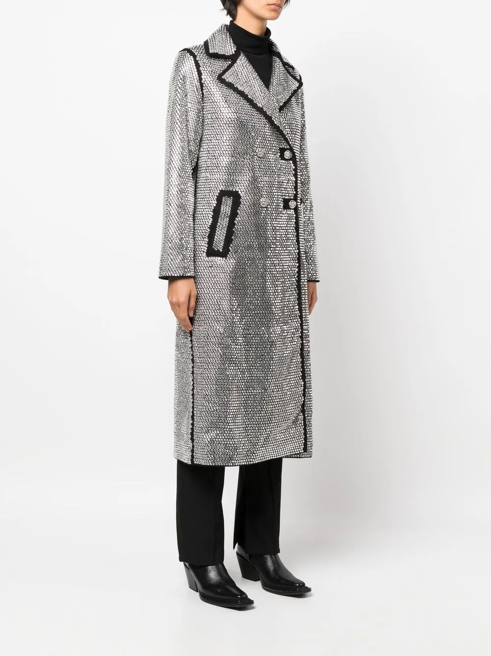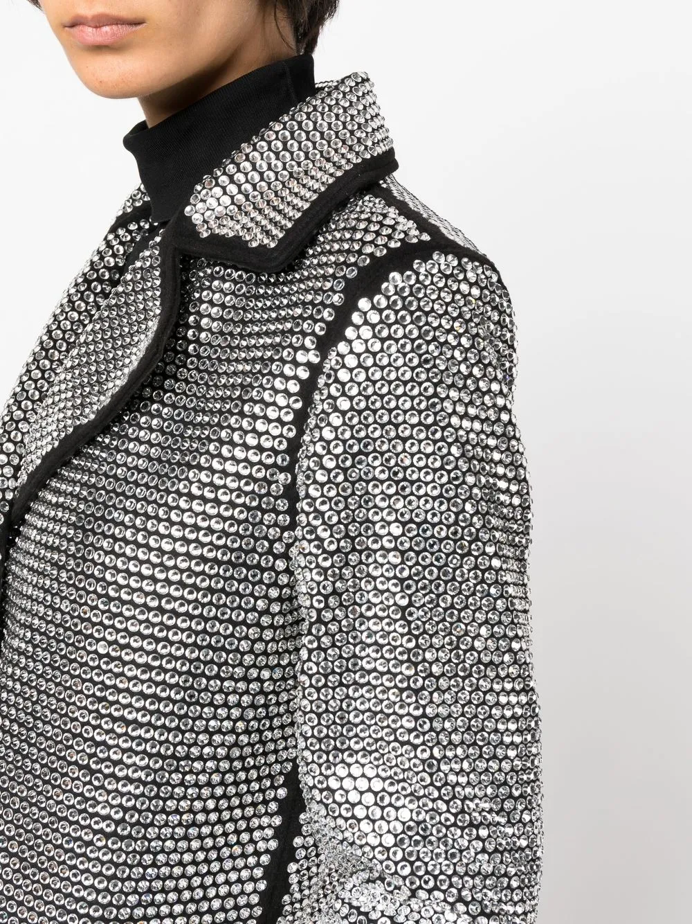 Эффект металлик, черный, декор из кристаллов, двубортная застежка на кнопки, отложный воротник, контрастная строчка и длинные рукава.