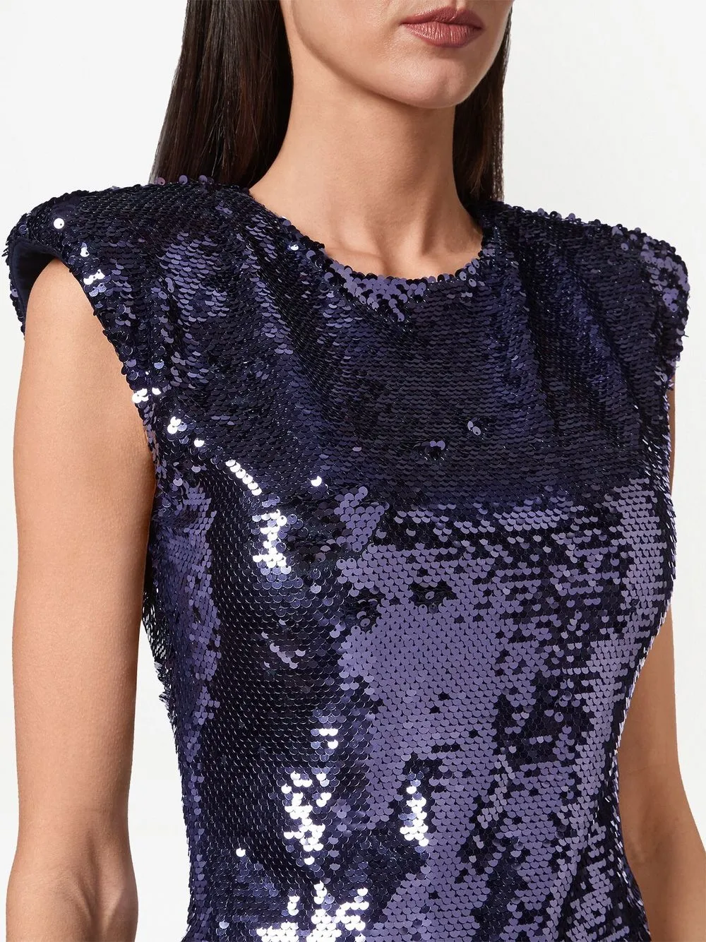 Черный, украшение из пайеток, круглый вырез, подплечники, без рукавов, застежка на молнии сзади и длина до бедер.