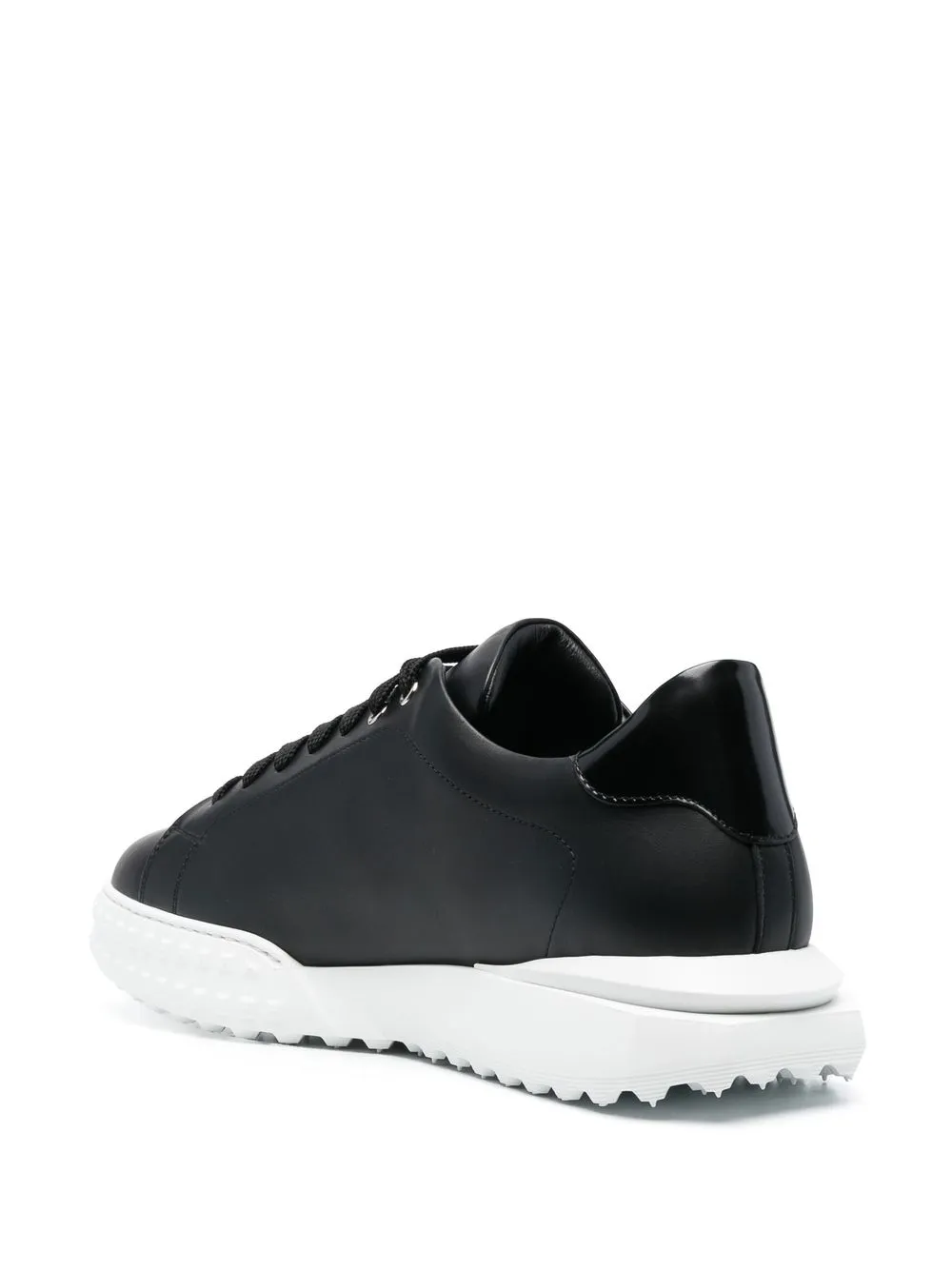 Черный, кожа, металлический логотип, шнуровка спереди, закругленный носок и плоская резиновая подошва.