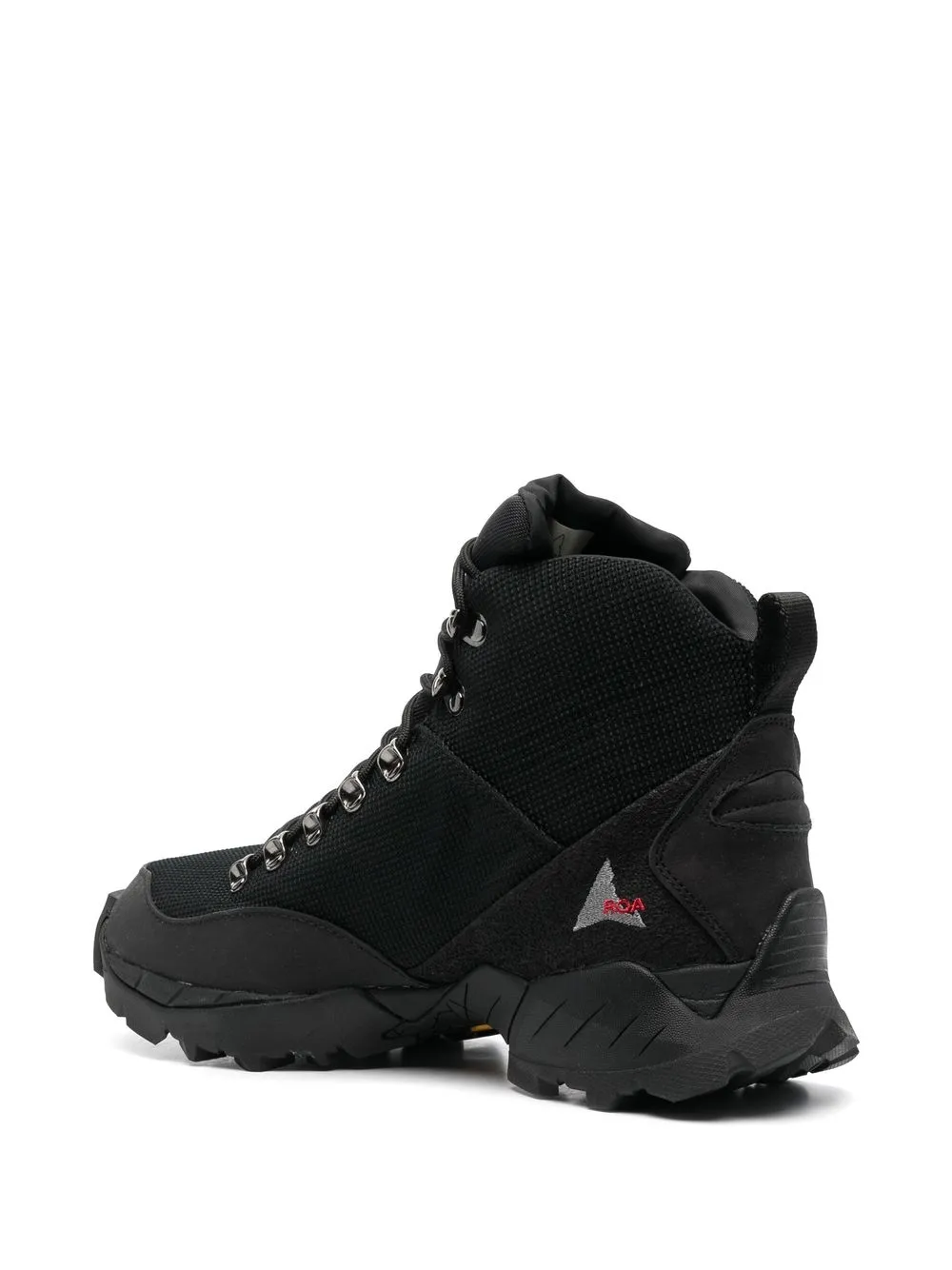Черный, кожа, сетка, логотип сбоку, рифленая резиновая подошва, петля для подтягивания сзади, шнуровка спереди и закругленный носок.