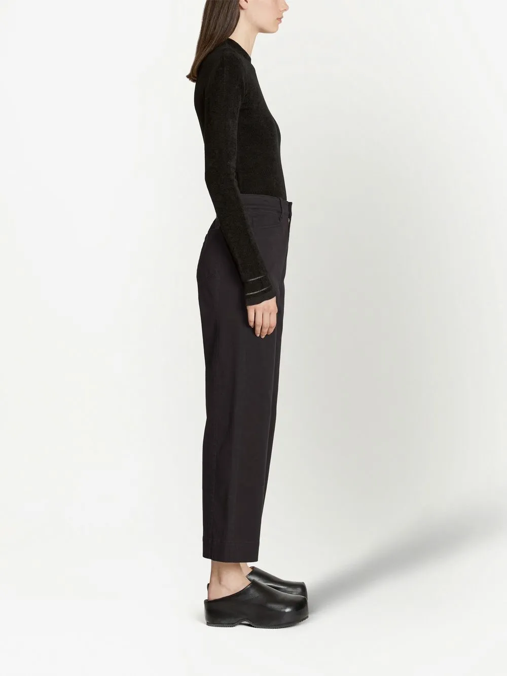 Черный, эластичный хлопок, ткань с твиловым переплетением, нашивка с логотипом сзади, петли для ремня, завышенная талия, широкий крой, застежка на молнии и пуговице спереди, два прорезных кармана по бокам, два накладных кармана сзади и укороченная длина.