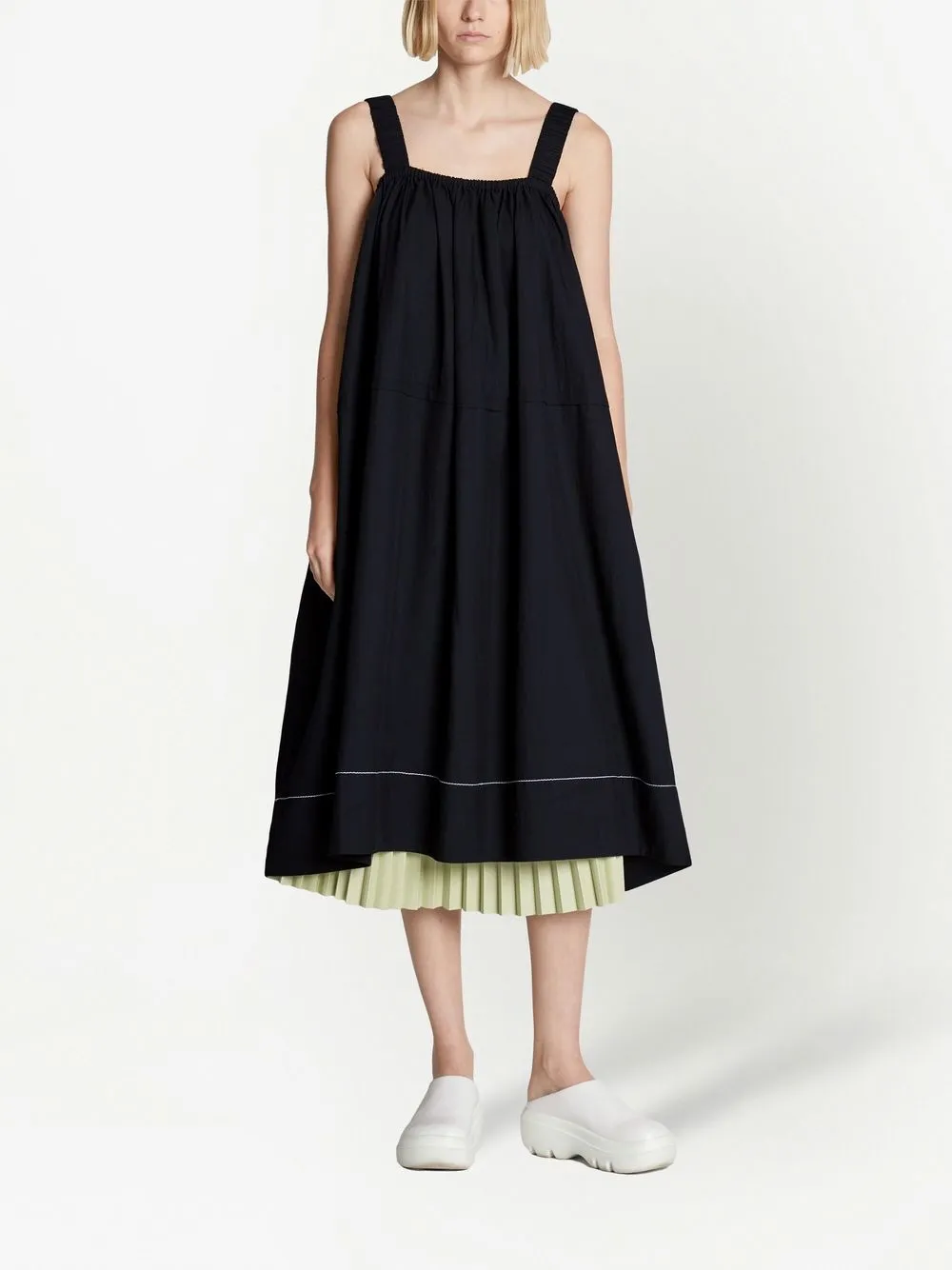 Черный, квадратный вырез, широкие бретели, ремень на талии, без рукавов, расклешенный крой, неравномерный подол и длина миди.