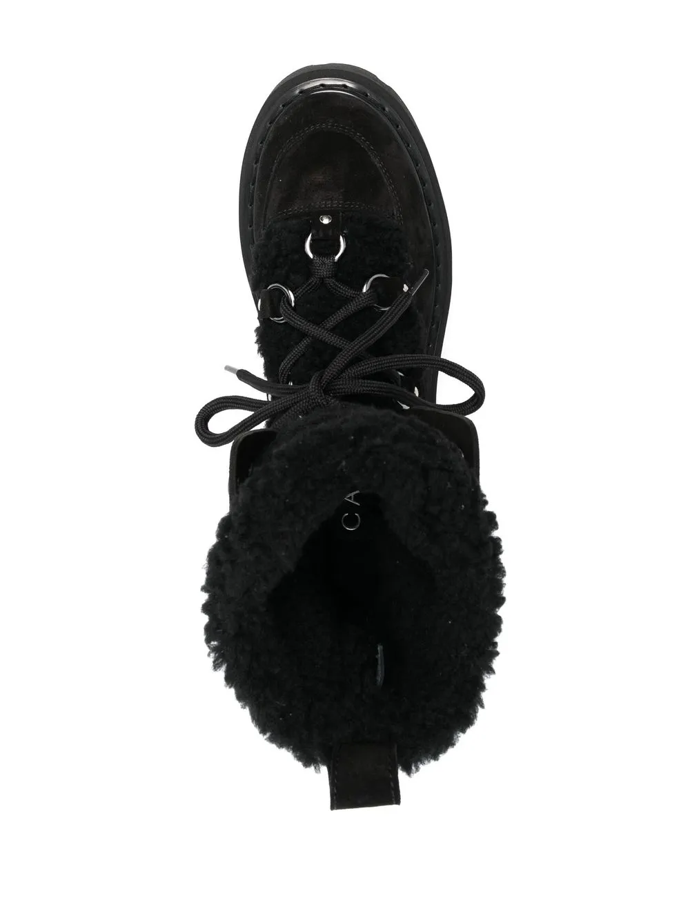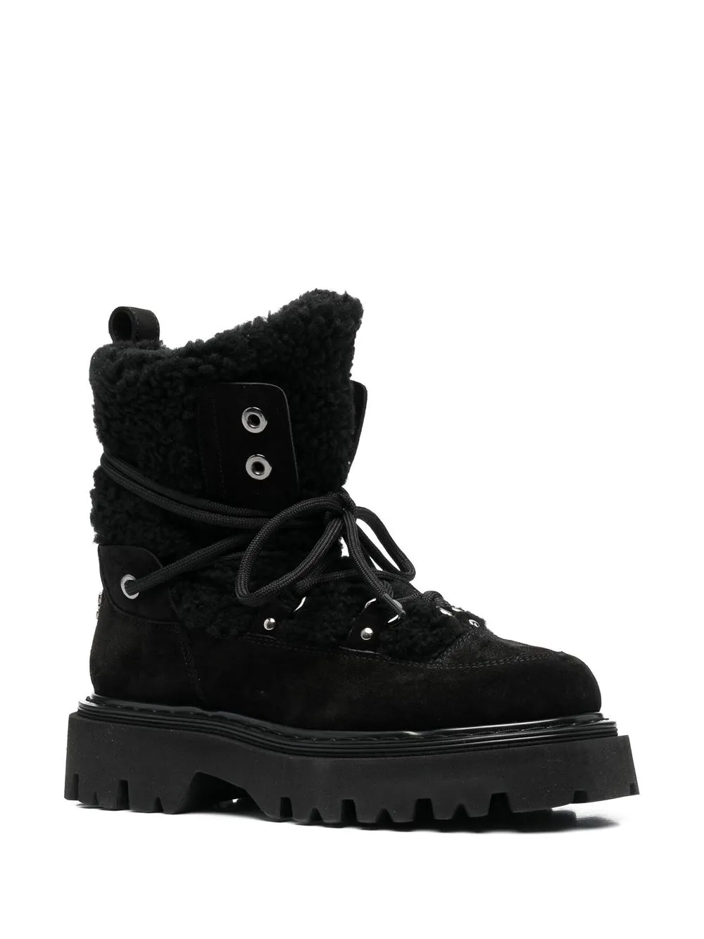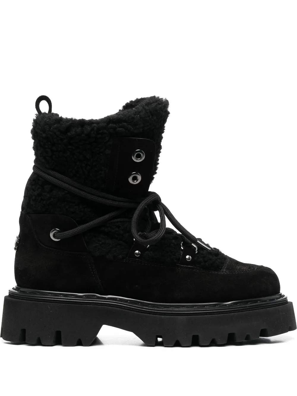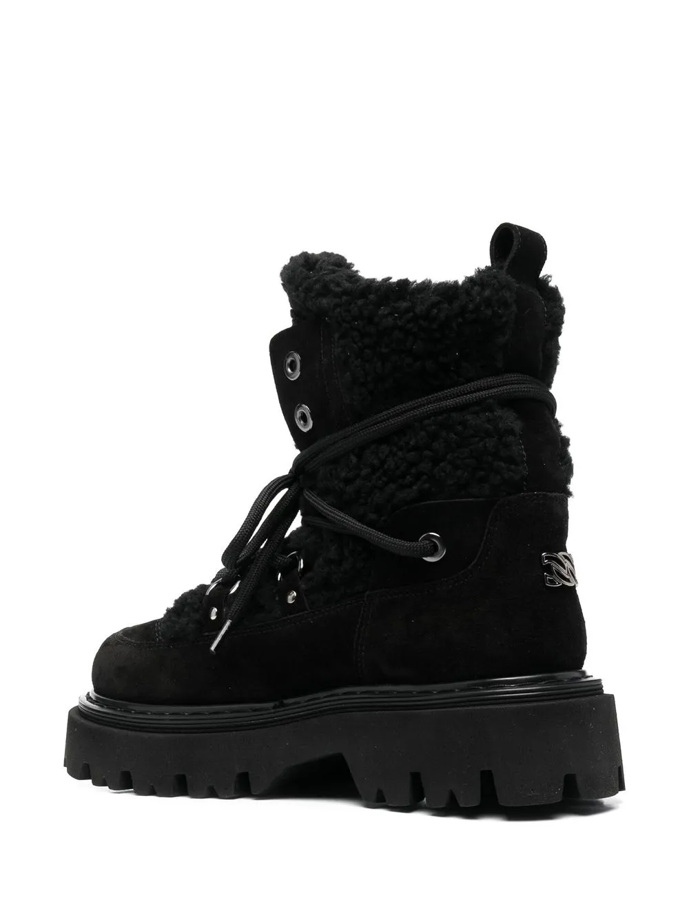 Черный, замша из телячьей кожи, вставки, логотип в тон, отделка из искусственного меха, люверсы, шнуровка спереди, закругленный носок, петля для подтягивания сзади, стелька с логотипом и массивная резиновая подошва c протектором.