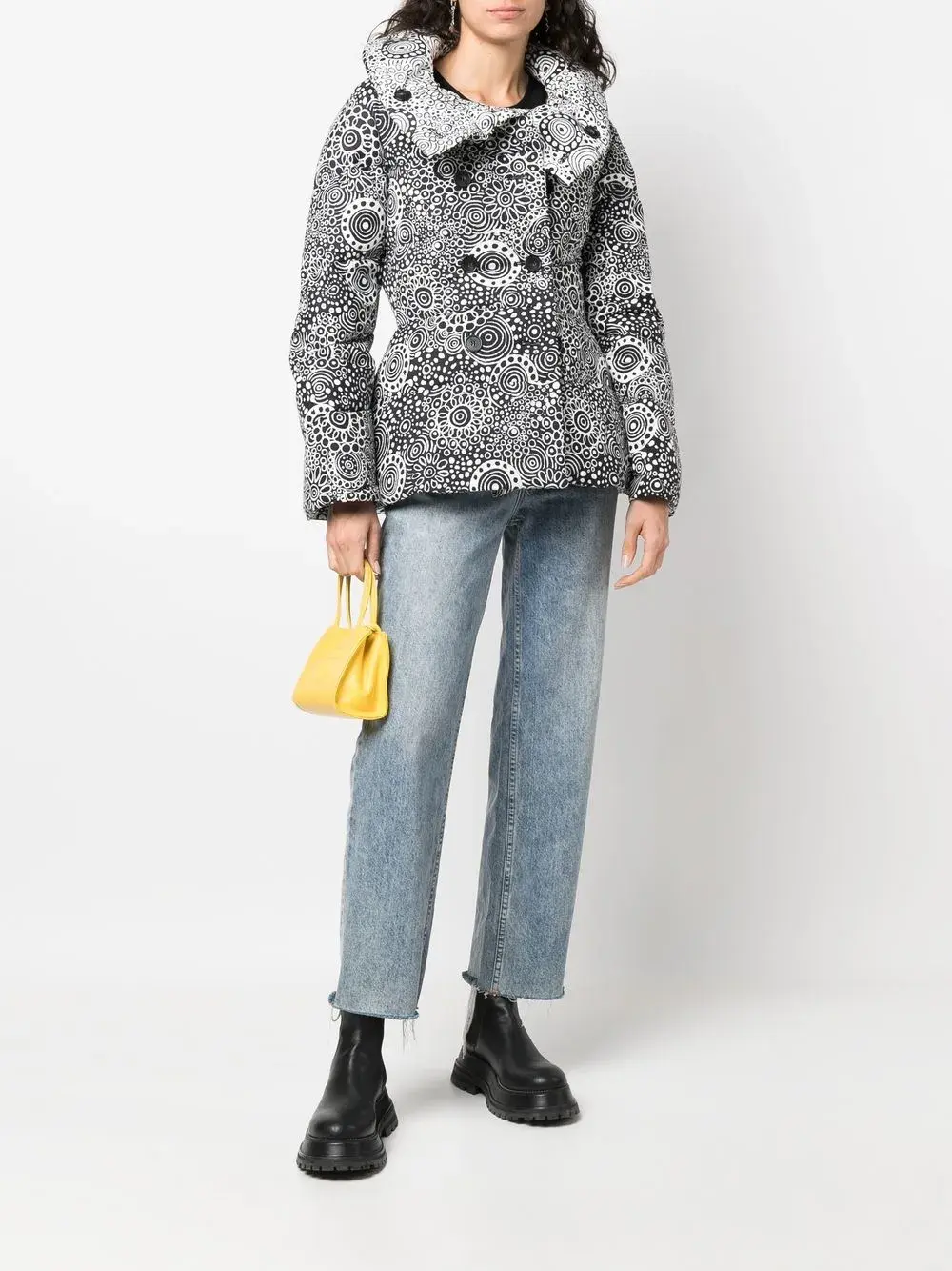 Черный, белый, косой воротник, принт пейсли, дутый материал, длинные рукава и планка на пуговицах спереди.