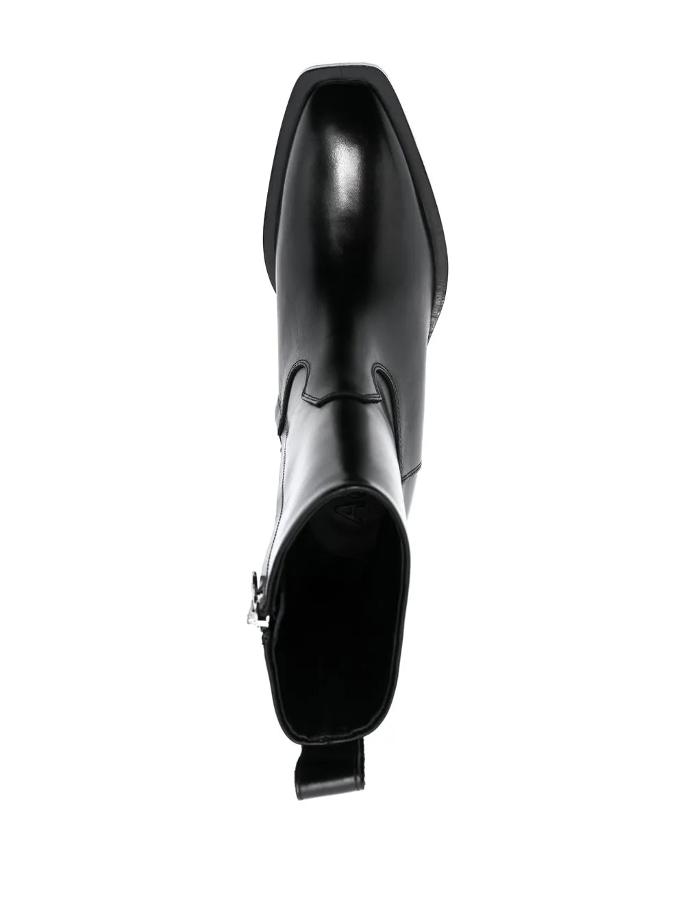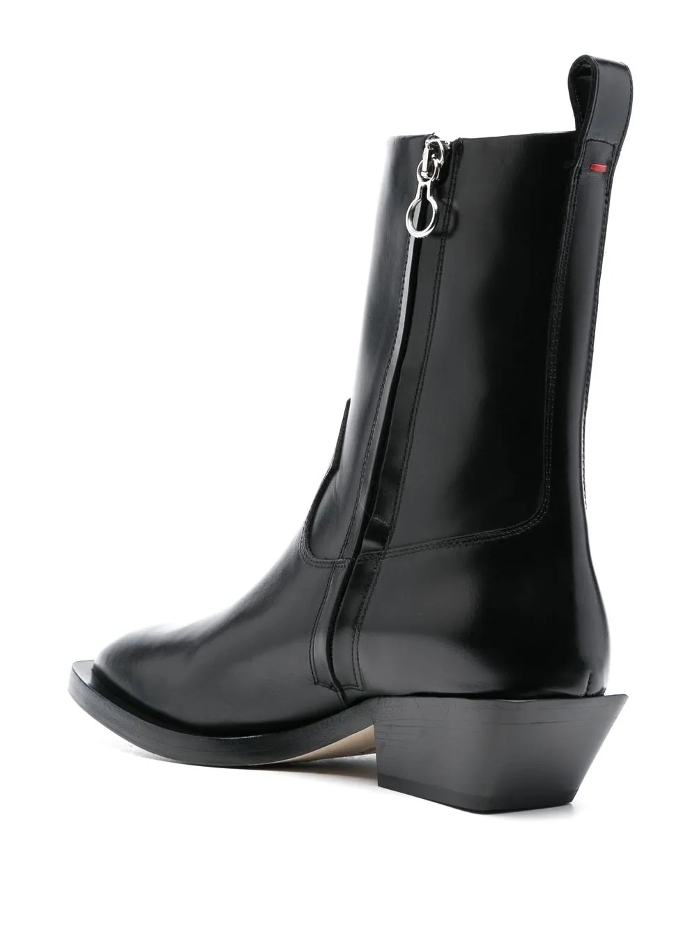 Глянцевая фактура, петля для подтягивания сзади, высота по щиколотку, заостренный носок и низкий каблук конической формы.