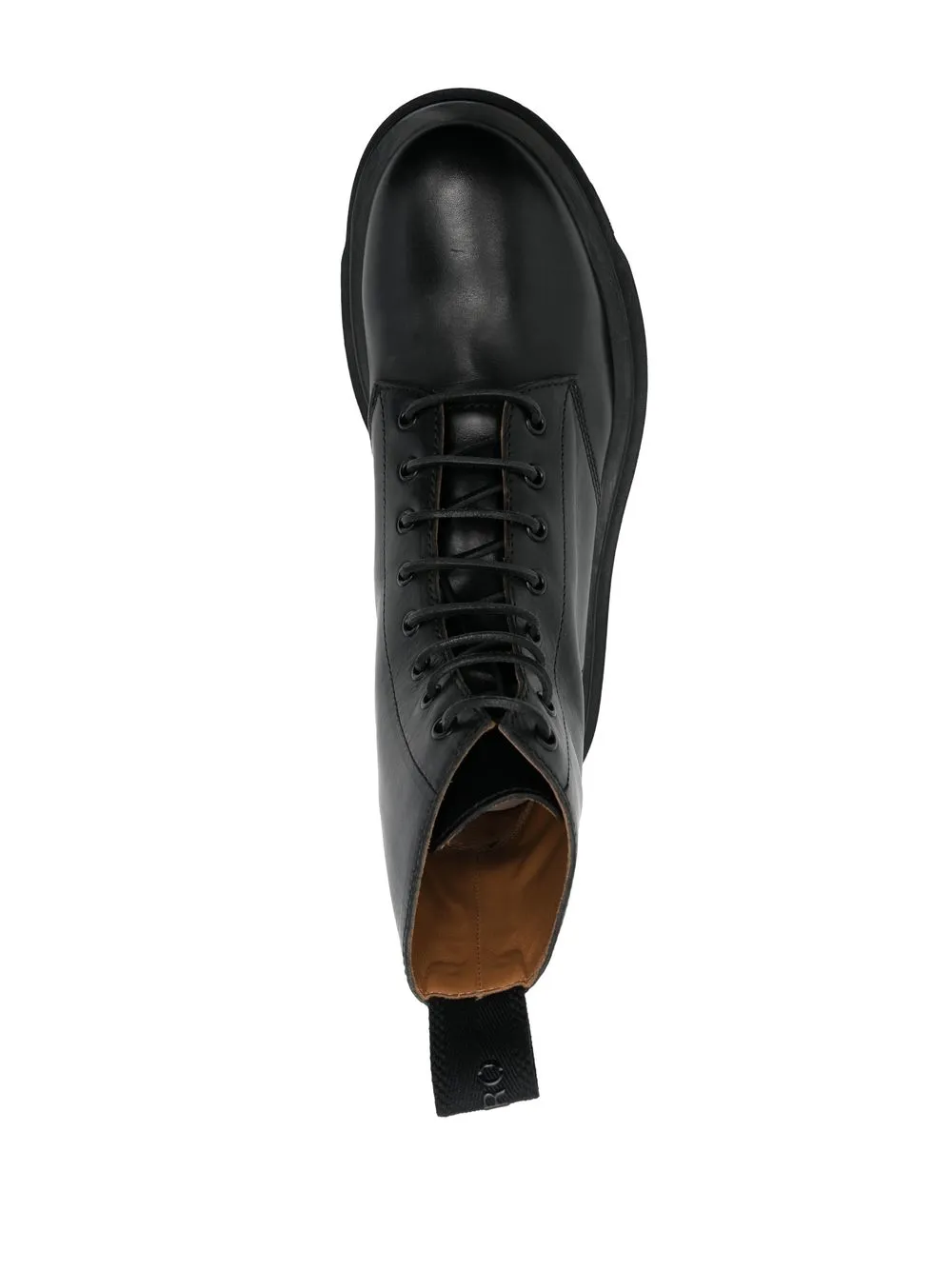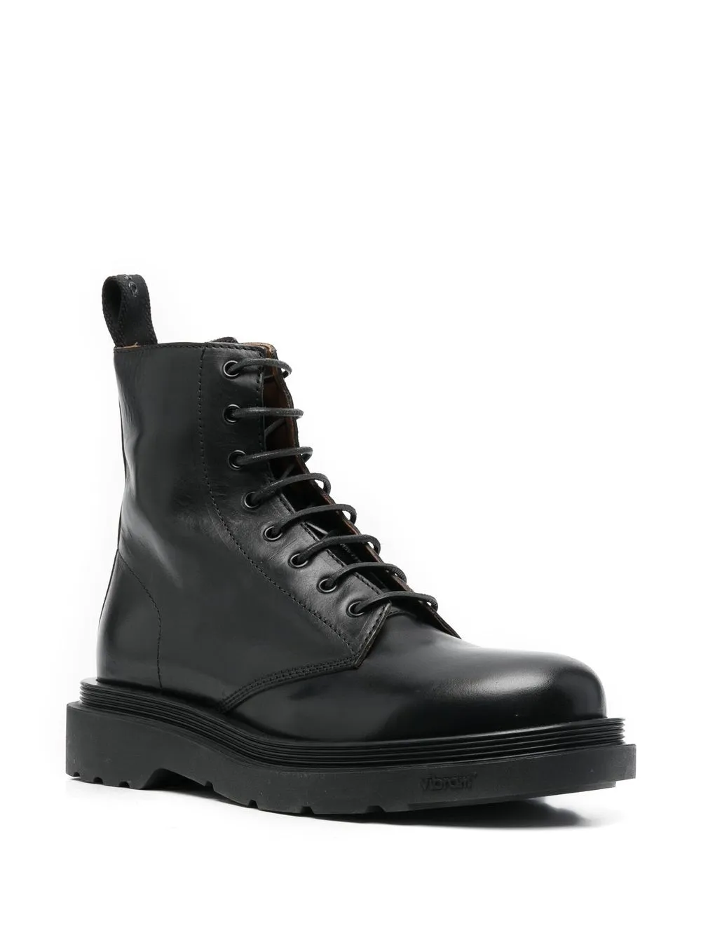 Черный, кожа, люверсы, шнуровка спереди, закругленный носок и массивная резиновая подошва.