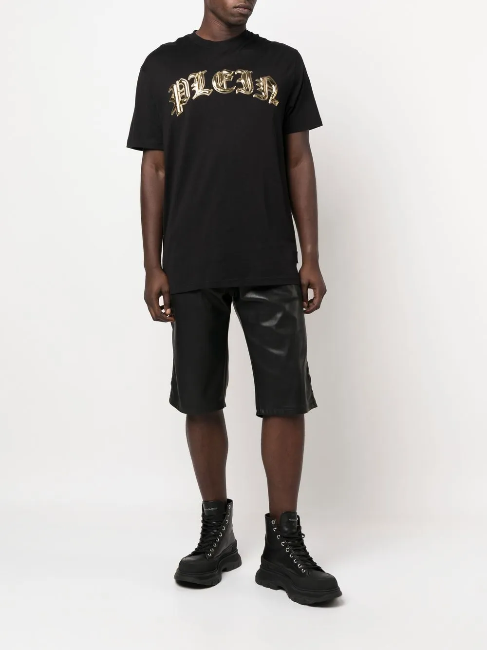 Черный, серебристый, логотип-аппликация, принт в готическом стиле, покрытие с эффектом металлик, нашивка с логотипом сзади, круглый вырез, короткие рукава и прямой подол.
