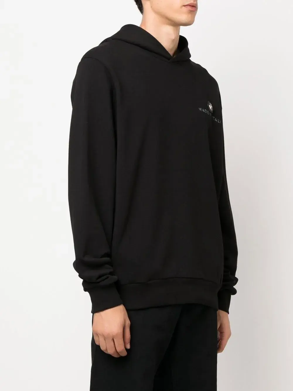 Черный, хлопок, принт с логотипом сзади, нашивка с логотипом на груди, объемный капюшон, длинные рукава и прямой подол.
