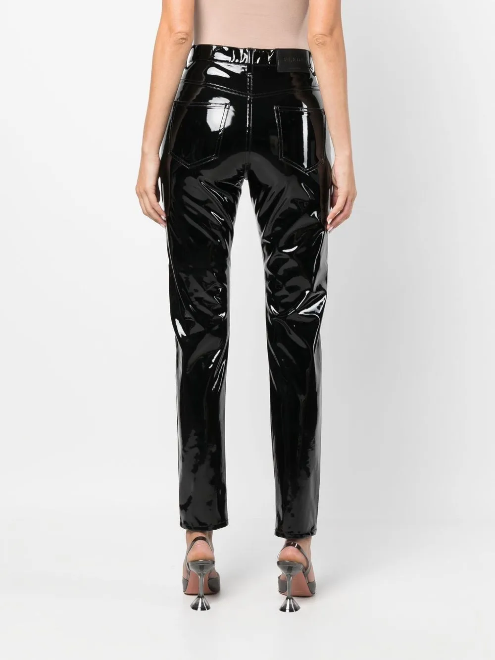 Черный, глянцевая фактура, нашивка с логотипом сзади, завышенная талия, петли для ремня, застежка на молнии и пуговице спереди, пять карманов и узкий крой.