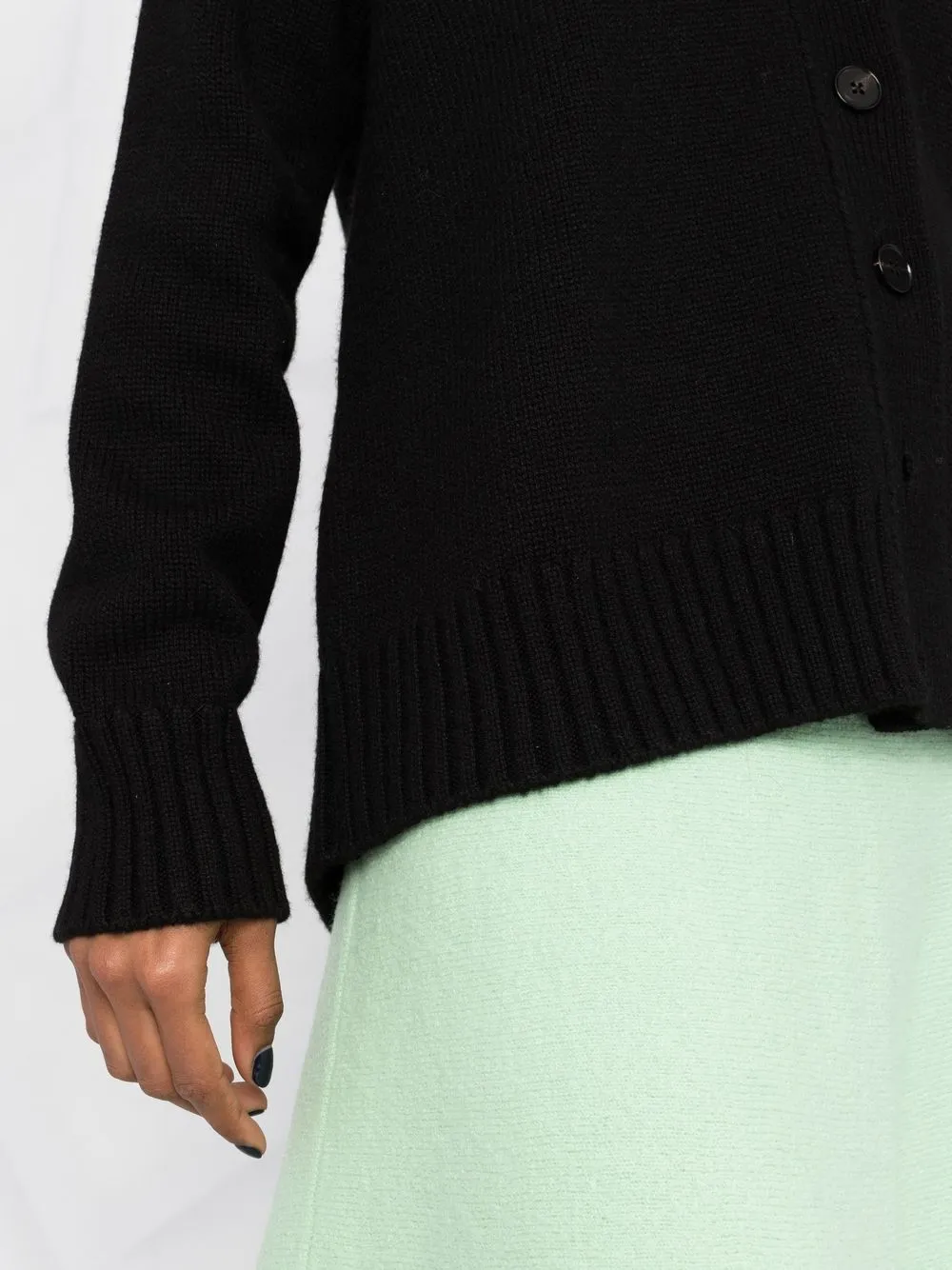 Черный, кашемир, трикотажный материал, V-образный вырез, длинные рукава и застежка на пуговицах спереди.