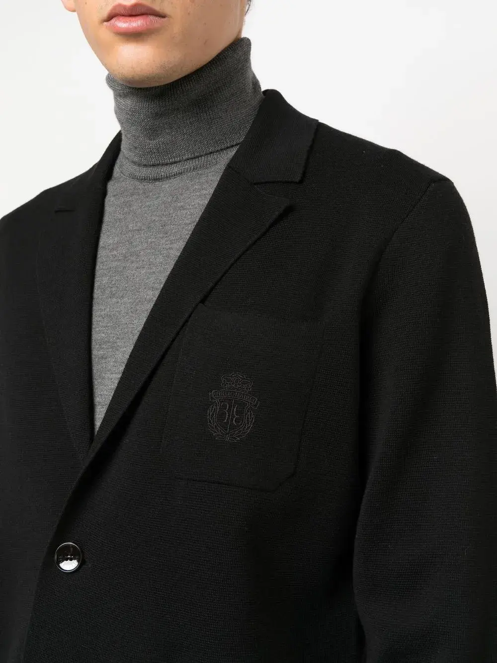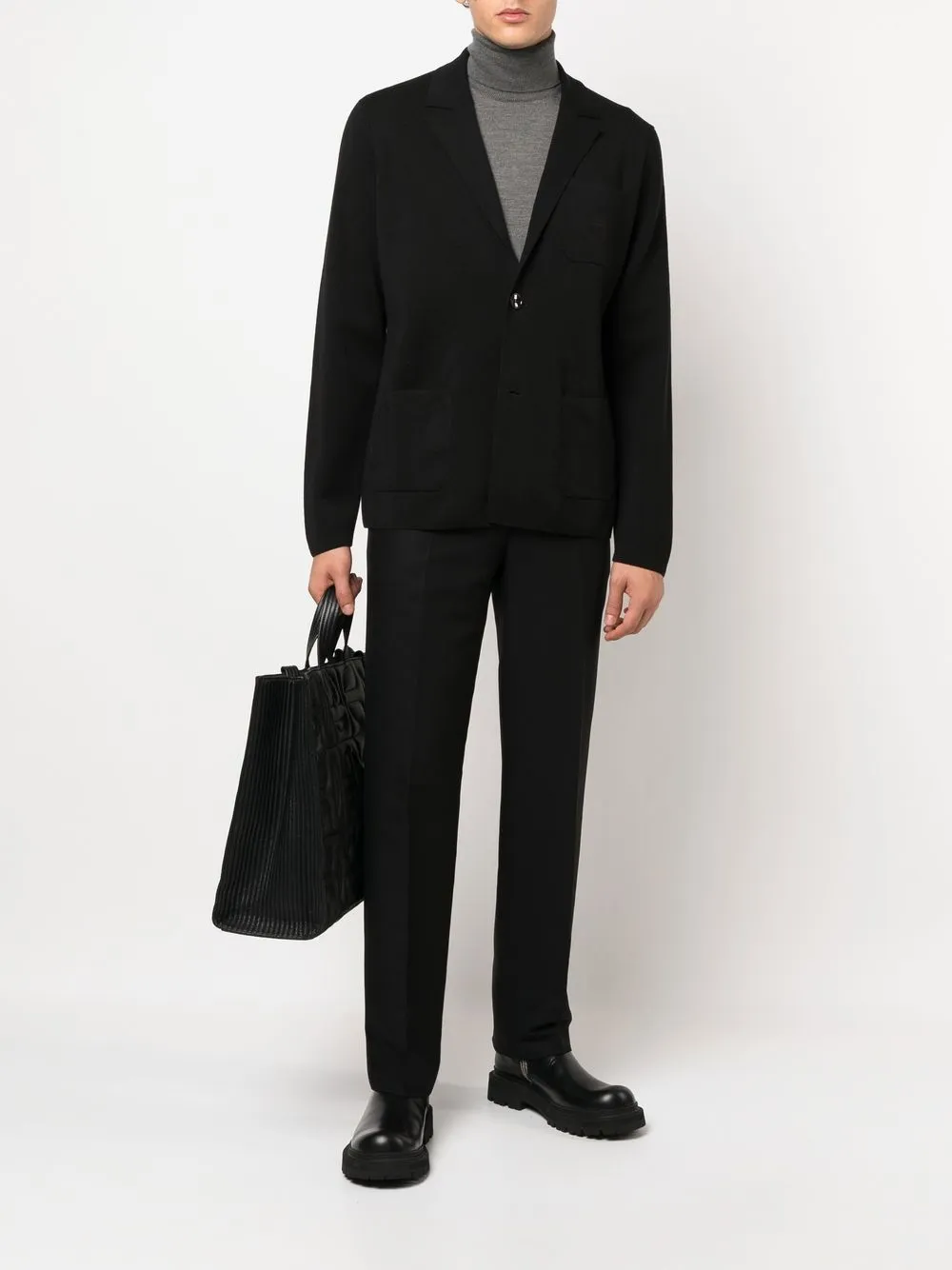 Черный, шерсть мериноса, трикотажный материал, тонкая вязка, застежка на пуговицах спереди, заостренные лацканы, прорезной карман на груди, два накладных кармана спереди, длинные рукава и прямой подол.