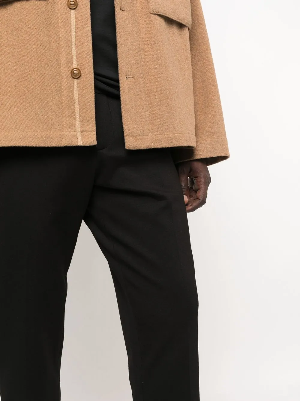 Черный, смесовый хлопок, кулиска на талии, застежка на молнии и пуговице спереди, два кармана по бокам, задние карманы с листочкой, зауженный крой и подвернутые манжеты.