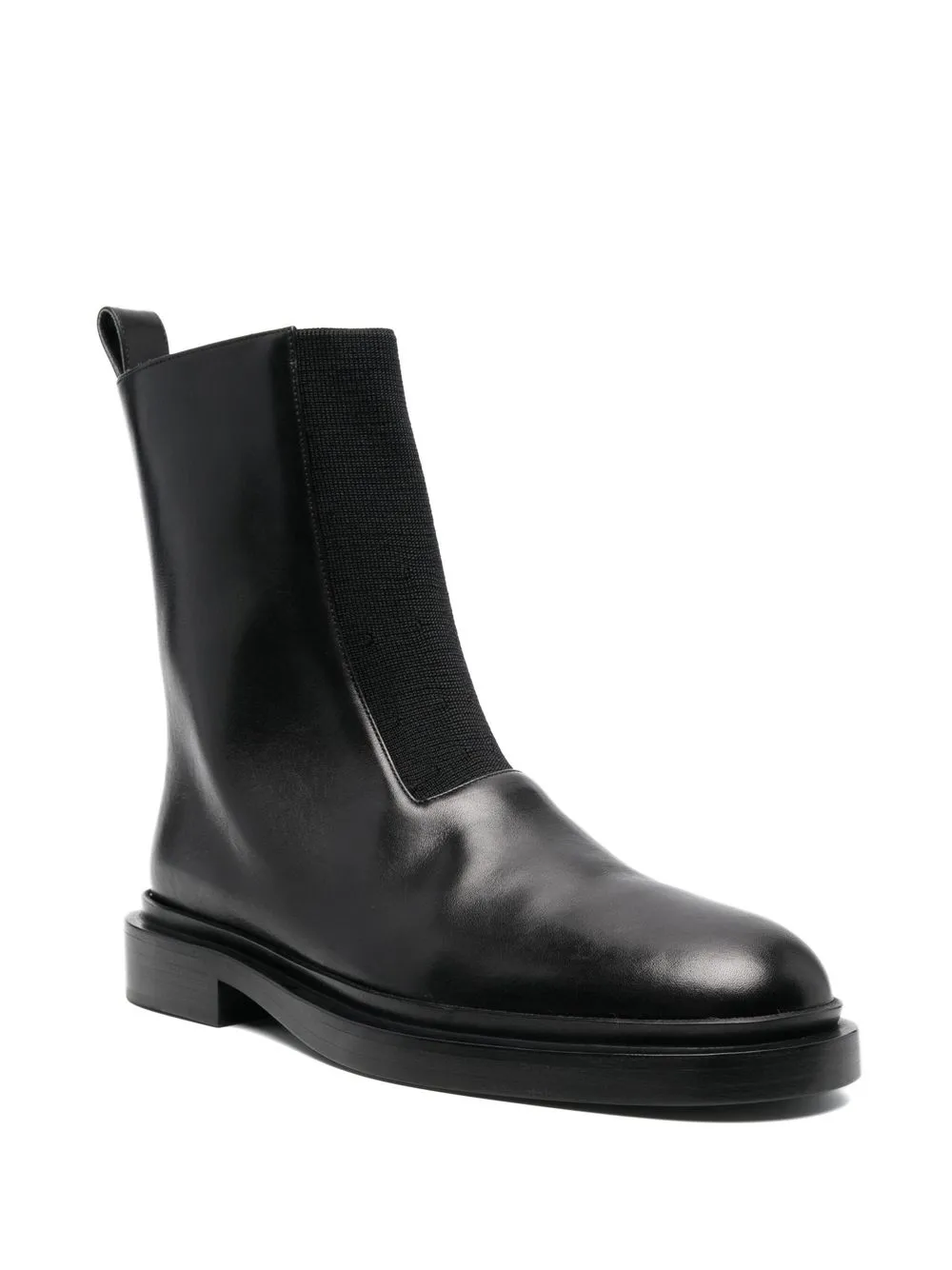 Черный, кожа, закругленный носок, петля для подтягивания сзади, эластичные вставки и плоская кожаная подошва.