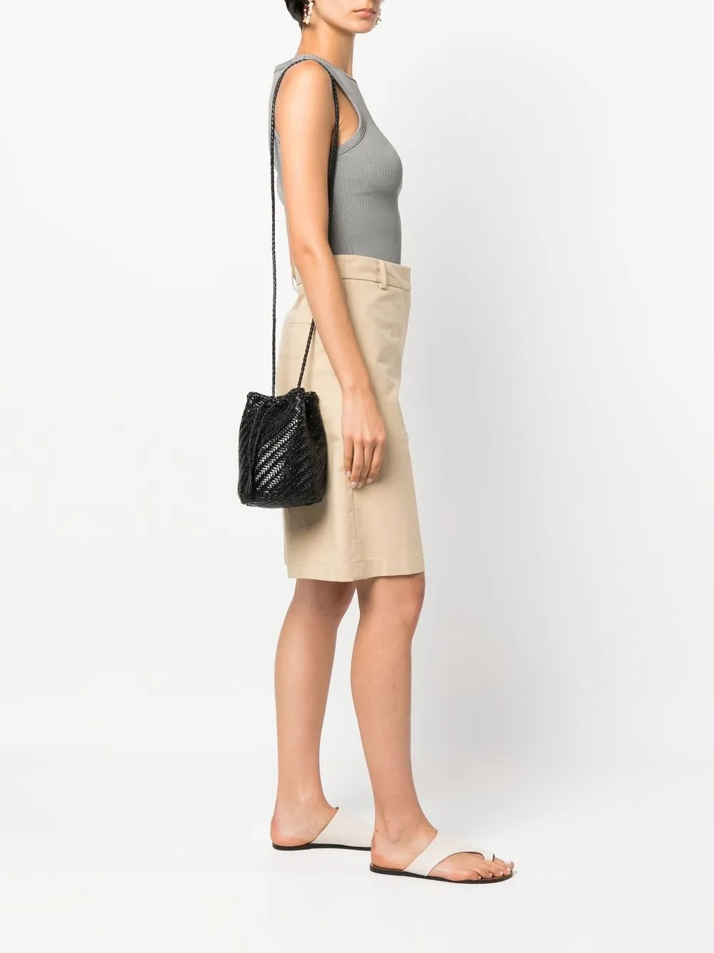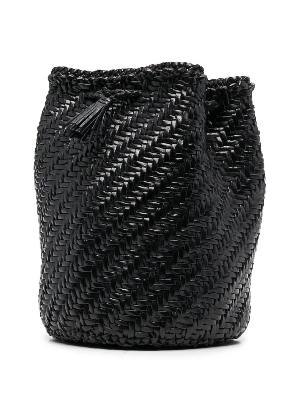 Черный, кожа, переплетенный дизайн, декоративные кисточки, модель ведро и кулиска.