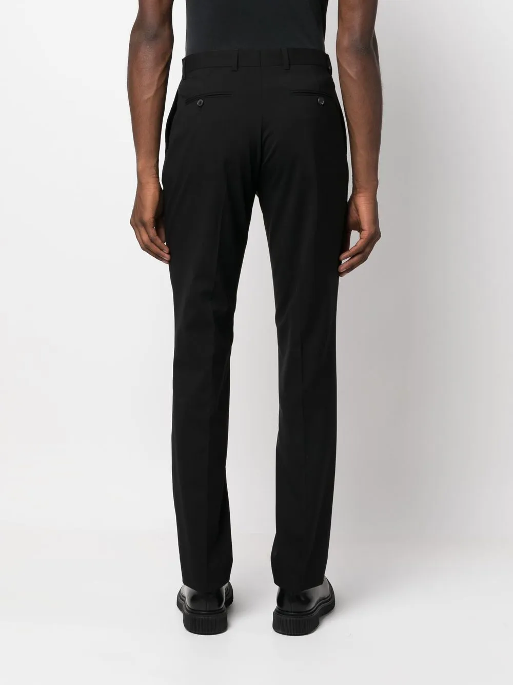 Смесь хлопка и шерсти, петли для ремня, застежка на молнию и крючок, два вшитых кармана по бокам, два прорезных кармана на пуговицах сзади, узкий крой и строгий крой.
