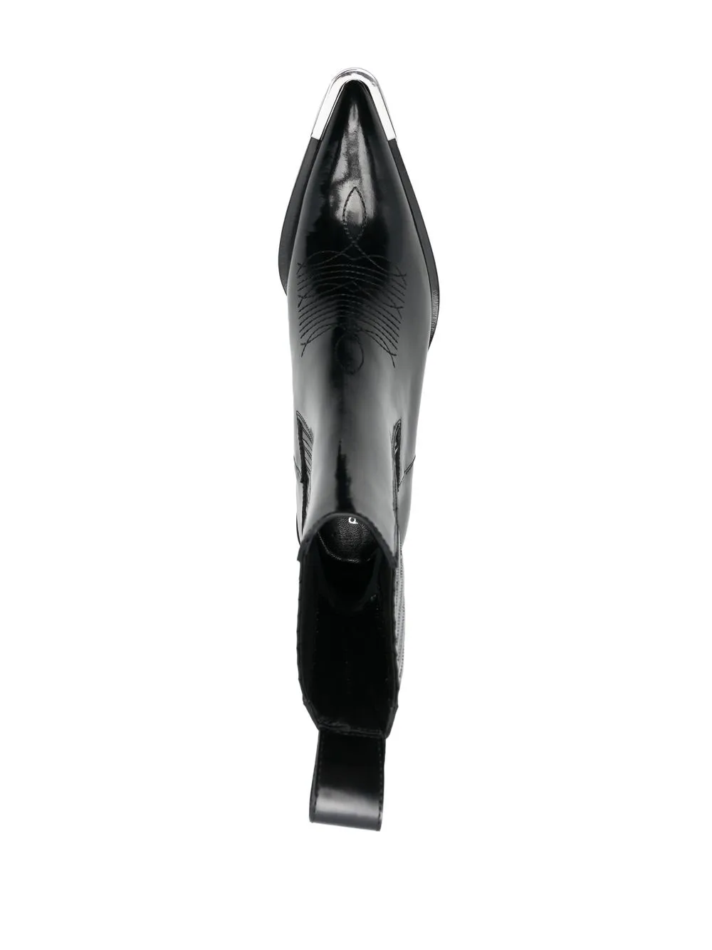 Черный, телячья кожа, декоративная строчка, двойная петля для подтягивания, заостренный носок и низкий блочный каблук.