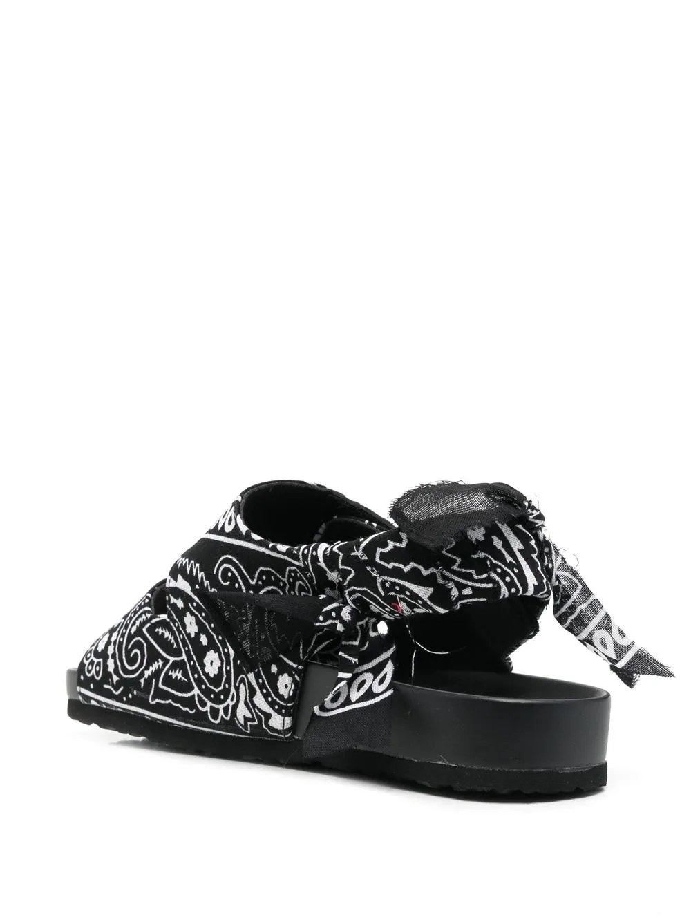 Черный/белый, узор пейсли, открытый носок, массивная резиновая подошва и застежка на завязке сзади.