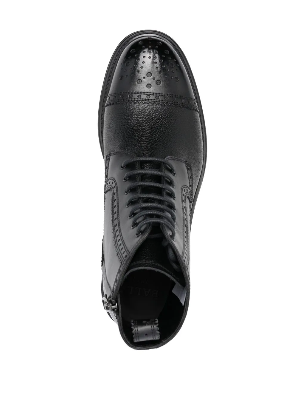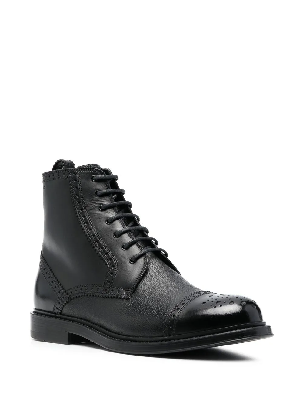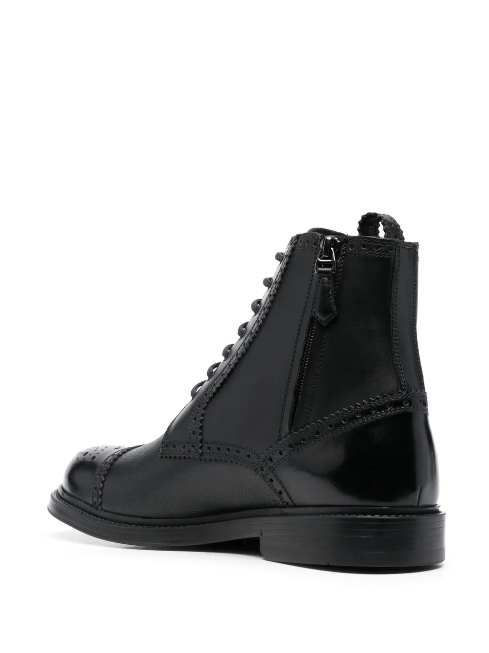 Черный, телячья кожа, кожаная подкладка, закругленный носок, шнуровка спереди, застежки на молнии сбоку, высота по щиколотку и низкий каблук.