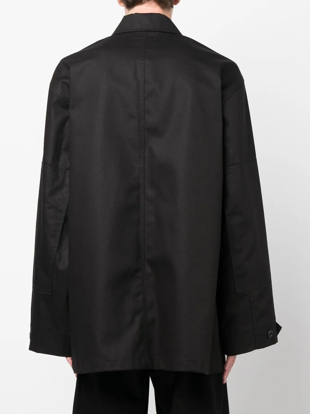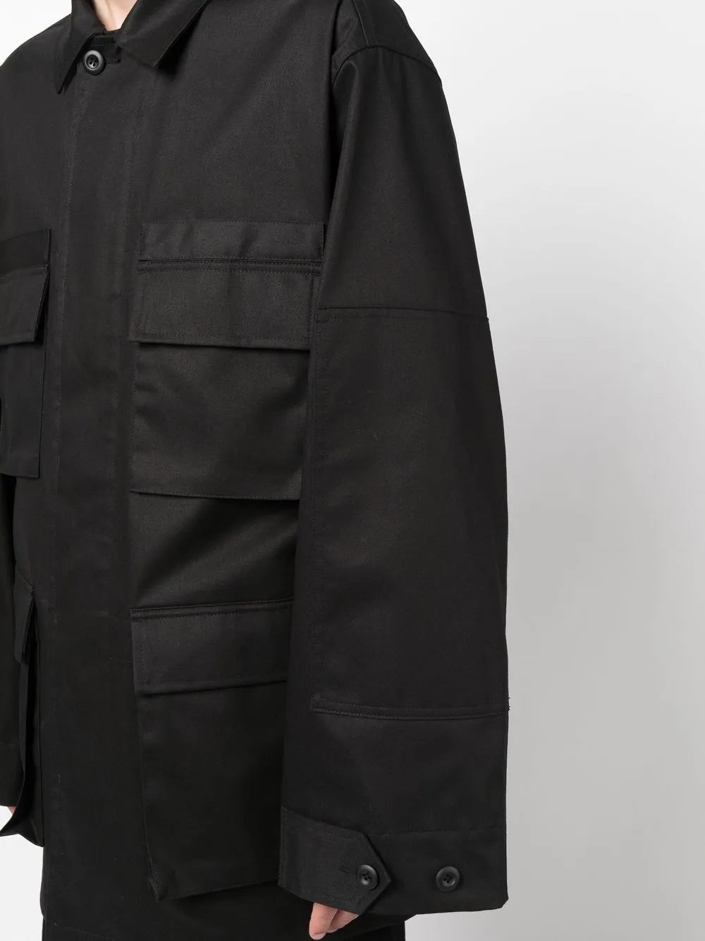 Черный, хлопок, четыре накладных кармана спереди, классический воротник, потайная пуговичная застежка спереди, длинные рукава, манжеты на пуговицах и прямой подол.