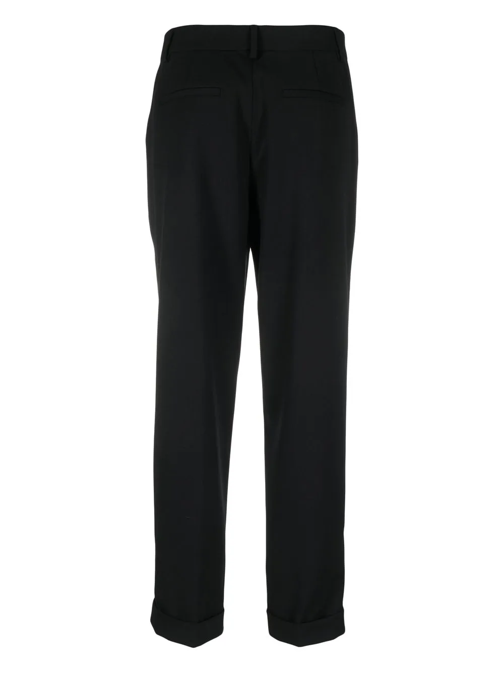 Черный, петли для ремня, потайная застежка спереди, узкий крой, два прорезных кармана по бокам, два кармана с листочкой сзади и подвороты.