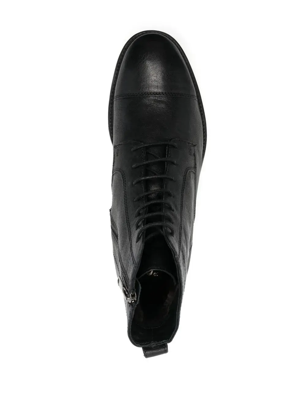 Черный, телячья кожа, вставки, миндалевидный носок, шнуровка спереди, застежка на молнии сбоку, петля для подтягивания сзади и низкий блочный каблук.