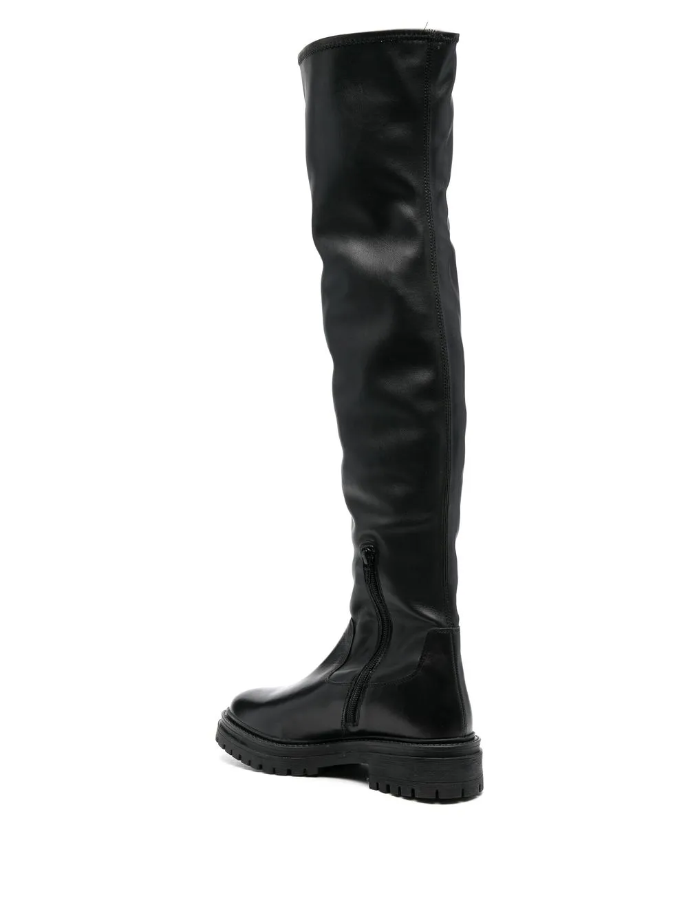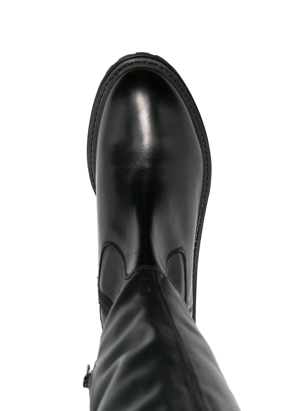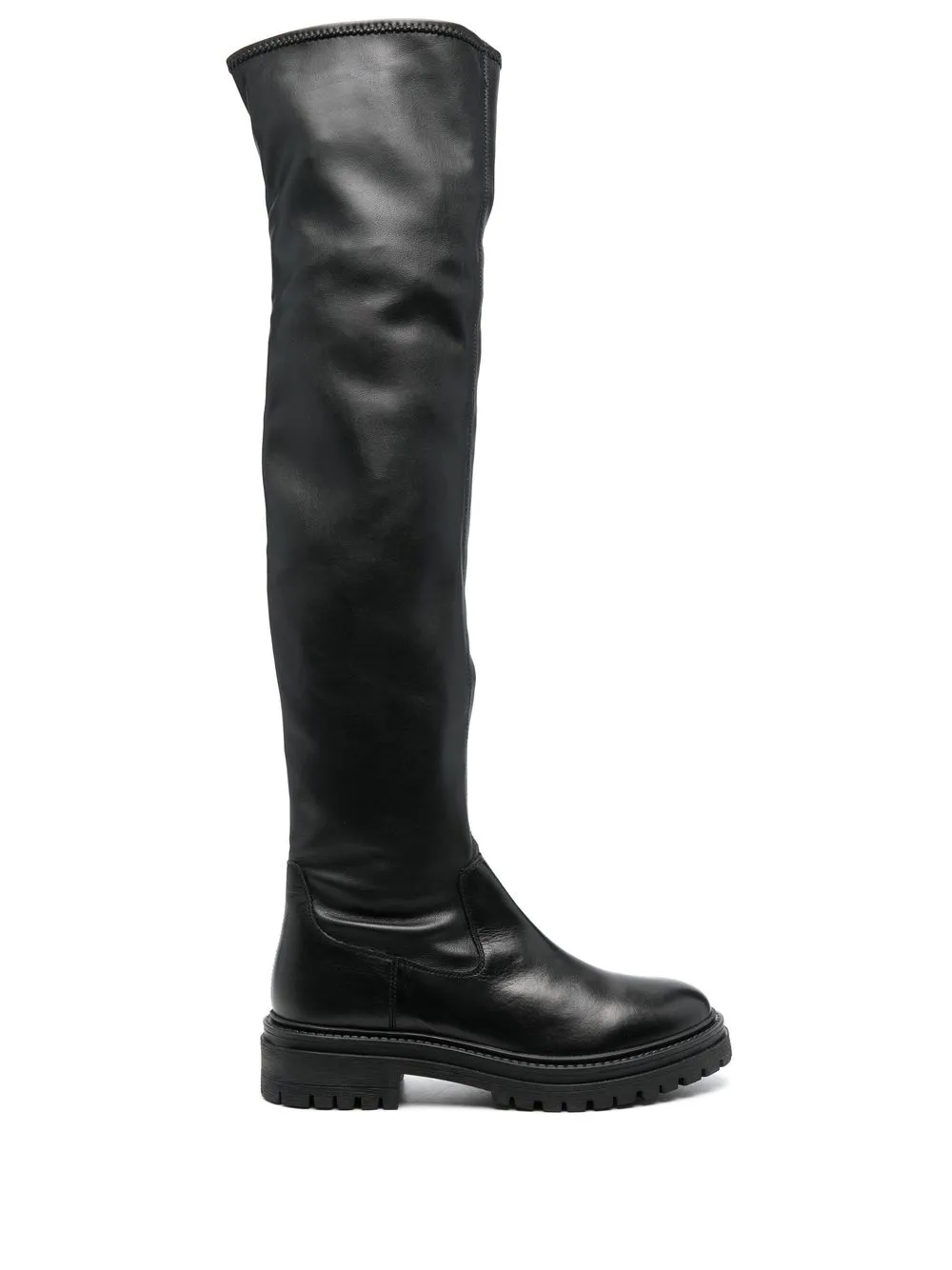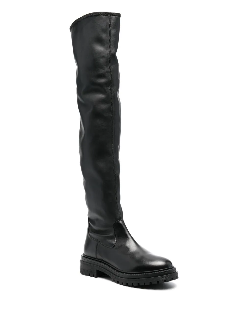 Черный, телячья кожа, эластичная отделка, закругленный носок, короткая застежка на молнии сбоку, длина выше колена, низкий каблук, рифленая резиновая подошва и модель без застежки.
