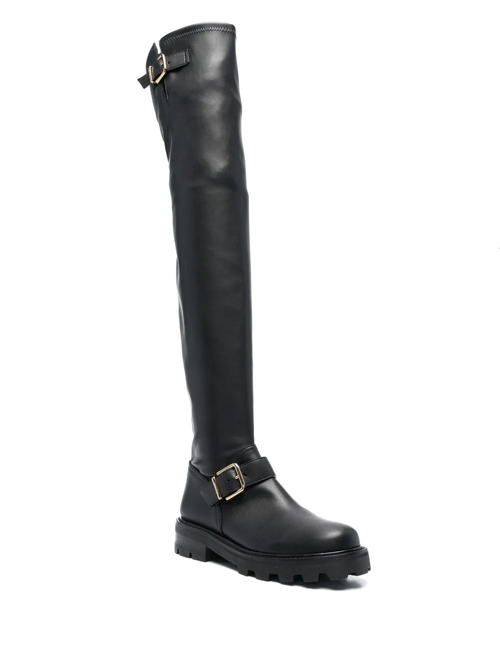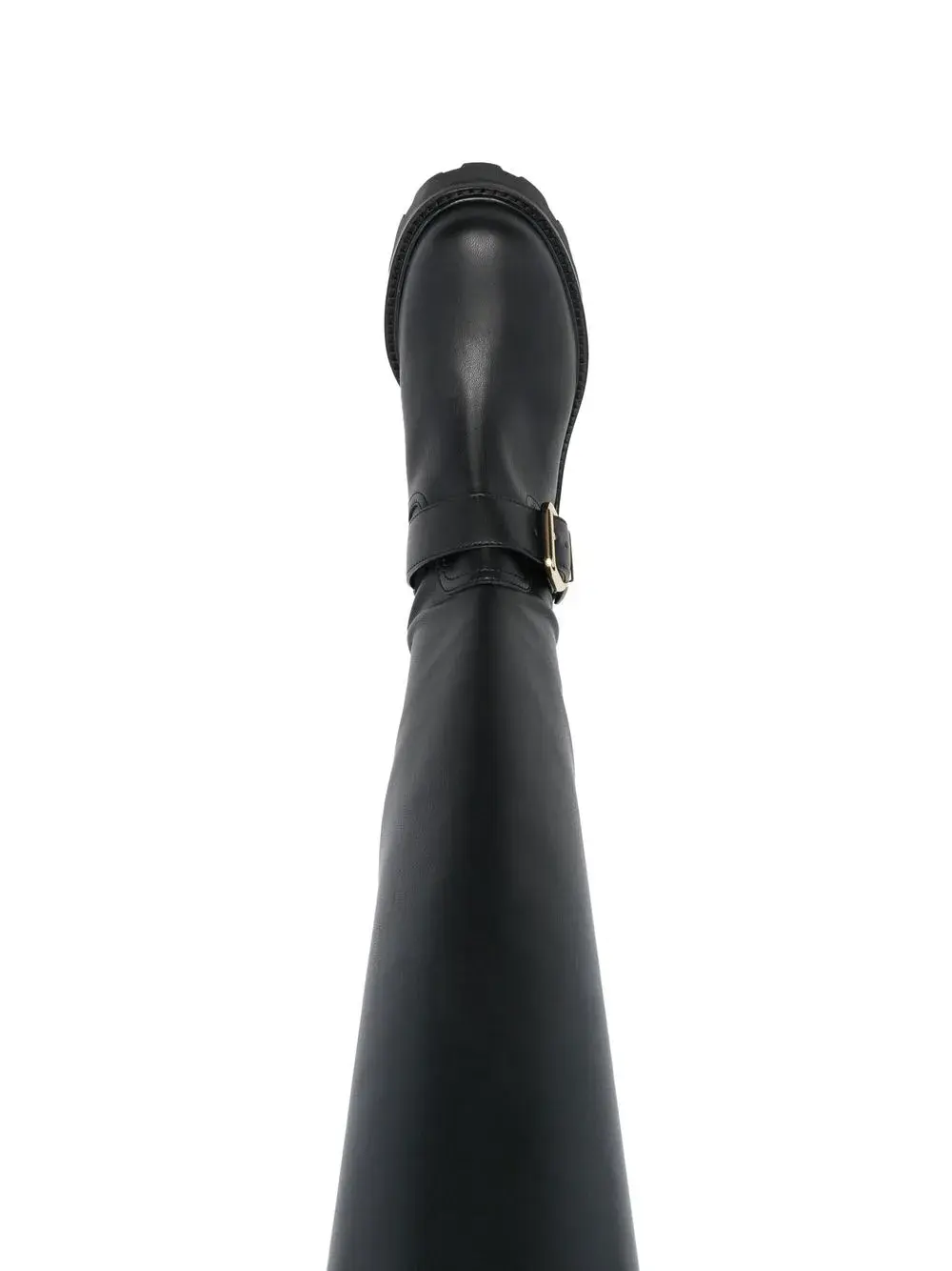 Металлический логотип, боковые застежки с пряжками, высота по колено, закругленный носок и рифленая резиновая подошва.