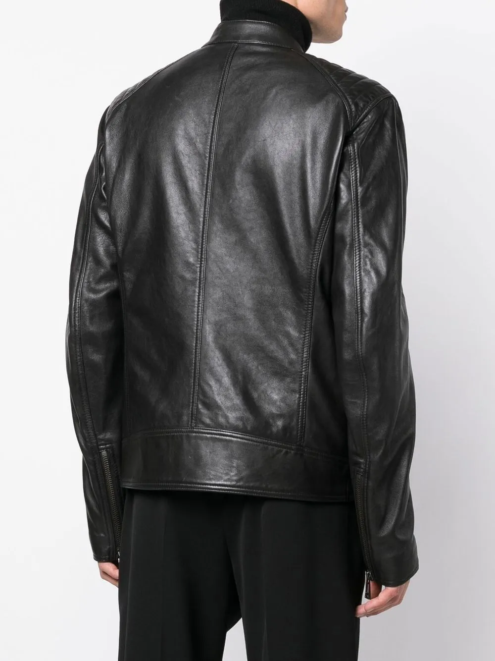 Черный, овечья кожа, воротник-стойка, застежка на молнии и пуговице спереди, два нагрудных кармана на молнии, два кармана на молнии по бокам, длинные рукава и прямой подол.