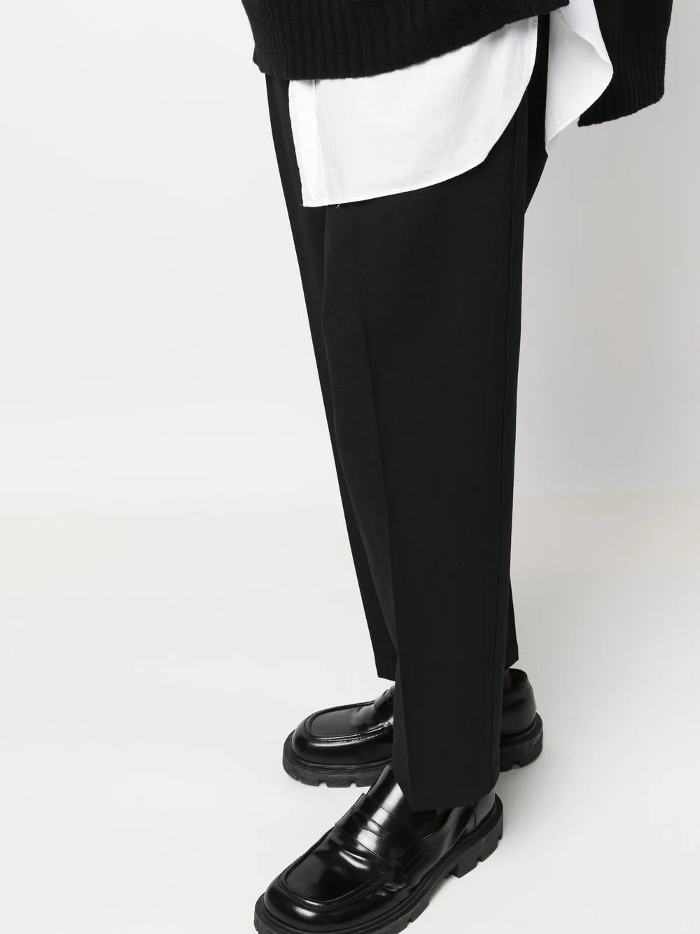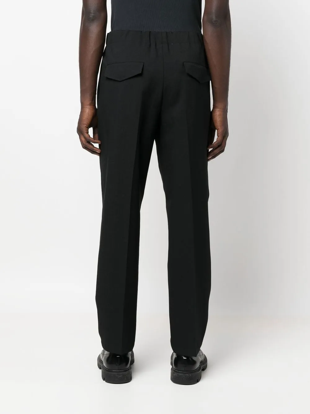 Черный, хлопок, средняя посадка, потайная застежка спереди, складки, два вшитых кармана по бокам и прямой крой.