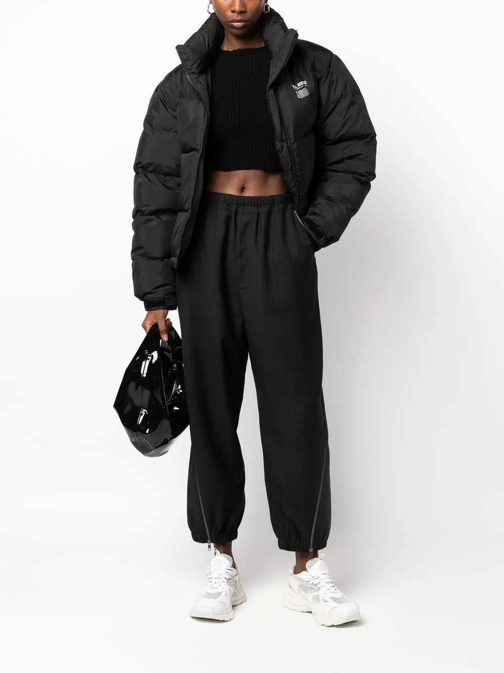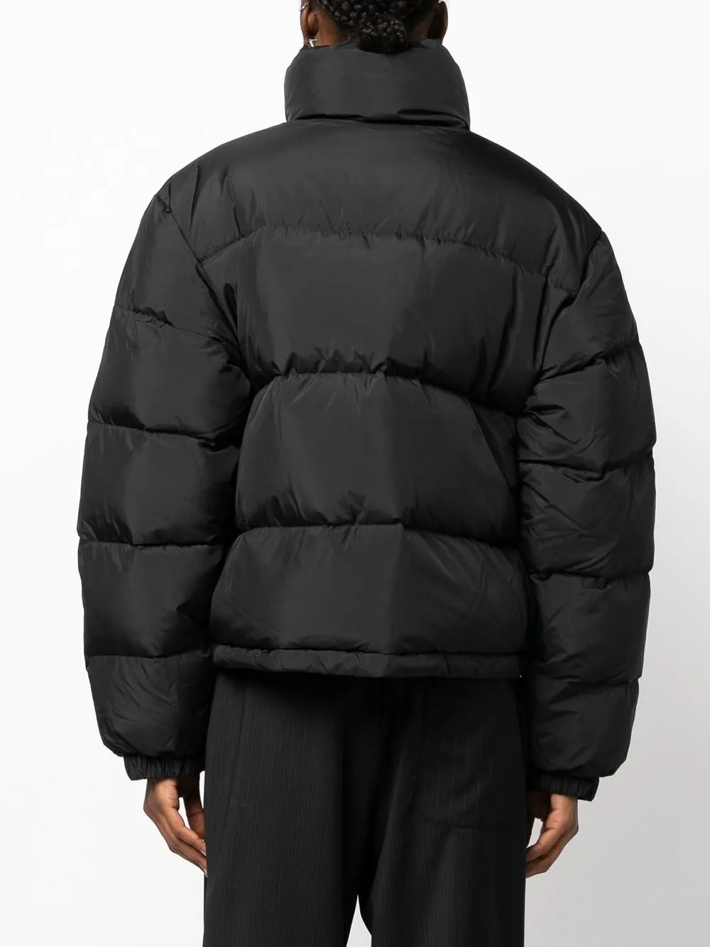 Черный/белый, наполнитель из пуха и перьев, дутый материал, принт с логотипом на груди, высокий воротник, застежка на молнии спереди, два кармана на молнии по бокам, длинные рукава и прямой подол.
