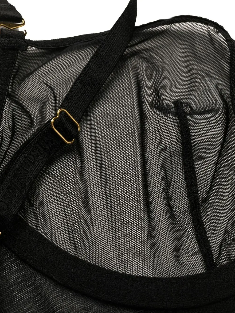 Черный, эластичный материал, сетчатые вставки, регулируемые тонкие бретели и застежка на крючок сзади.