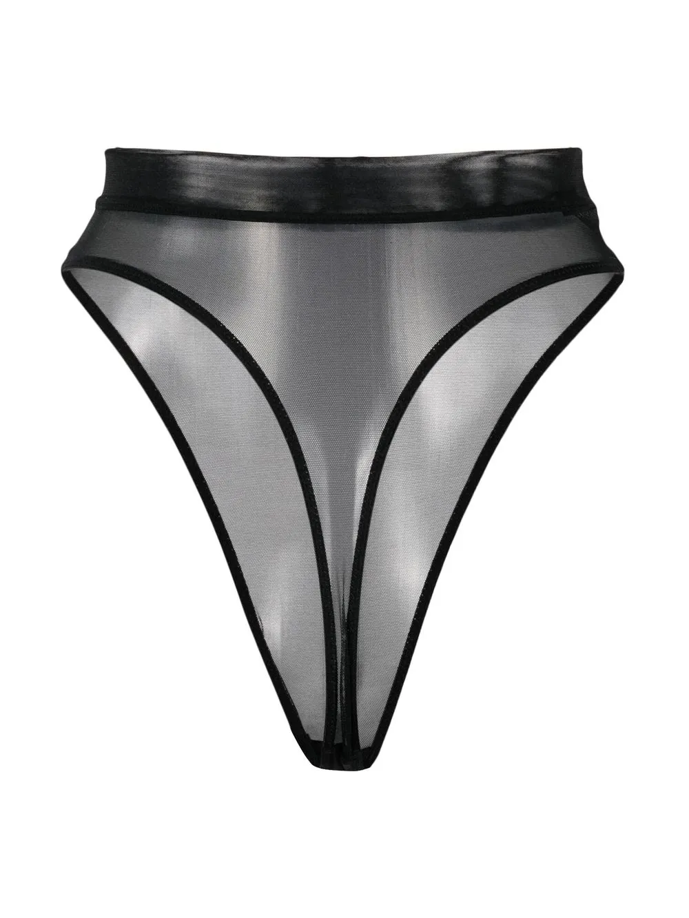 Черный, эластичный материал, завышенная талия, эластичный пояс и сетчатые вставки. Эту вещь можно примерить, но только поверх собственного белья.