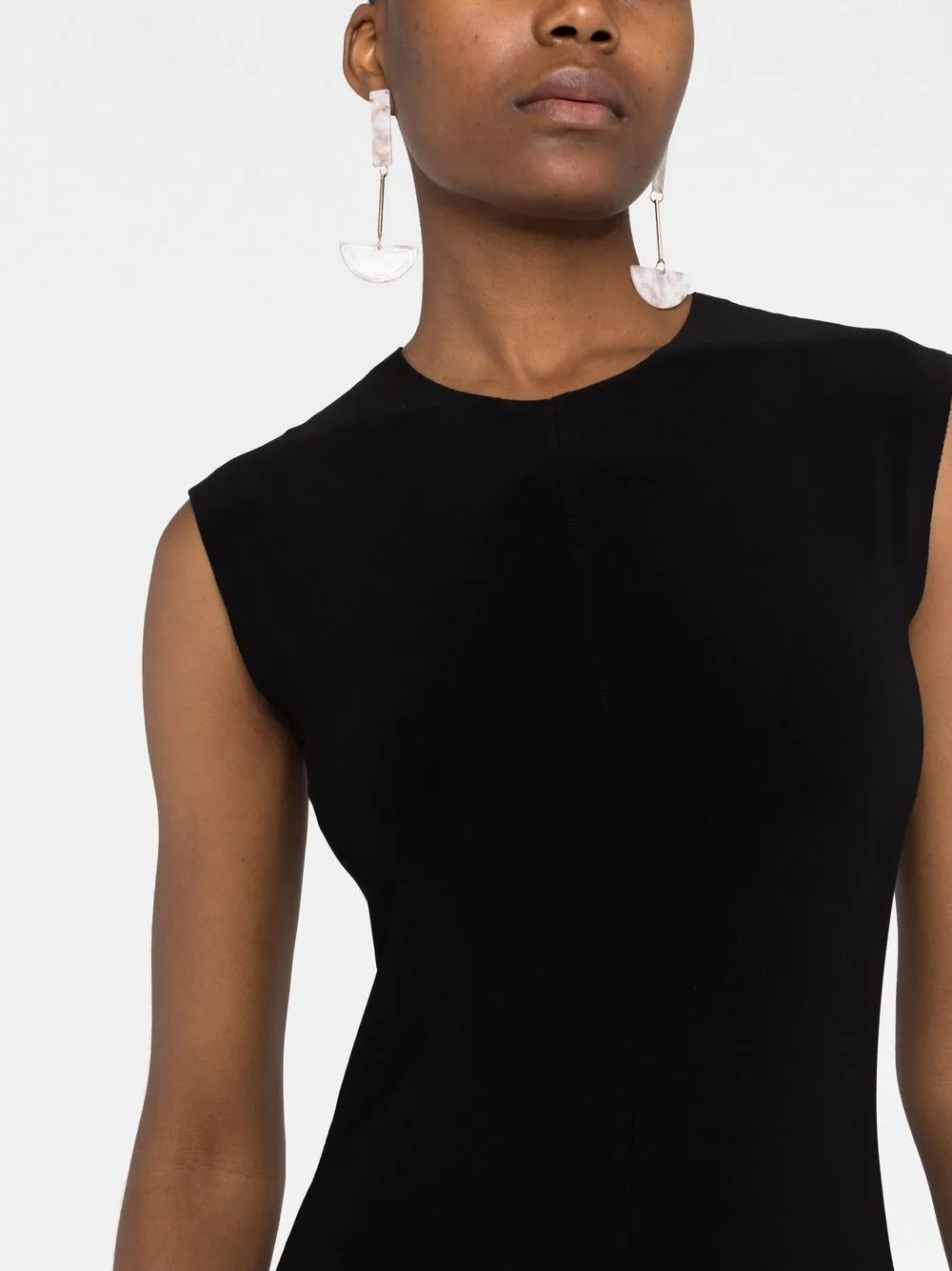 Черный, эластичный материал, круглый вырез, без рукавов, широкий крой и потайная застежка на молнии сзади.