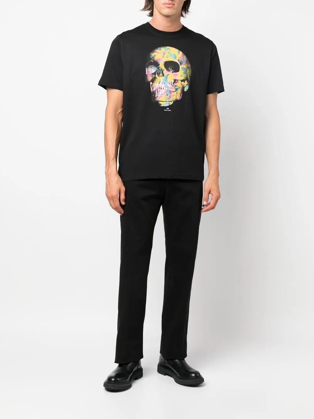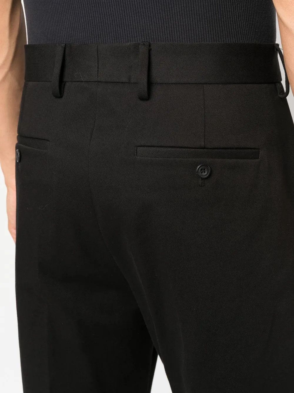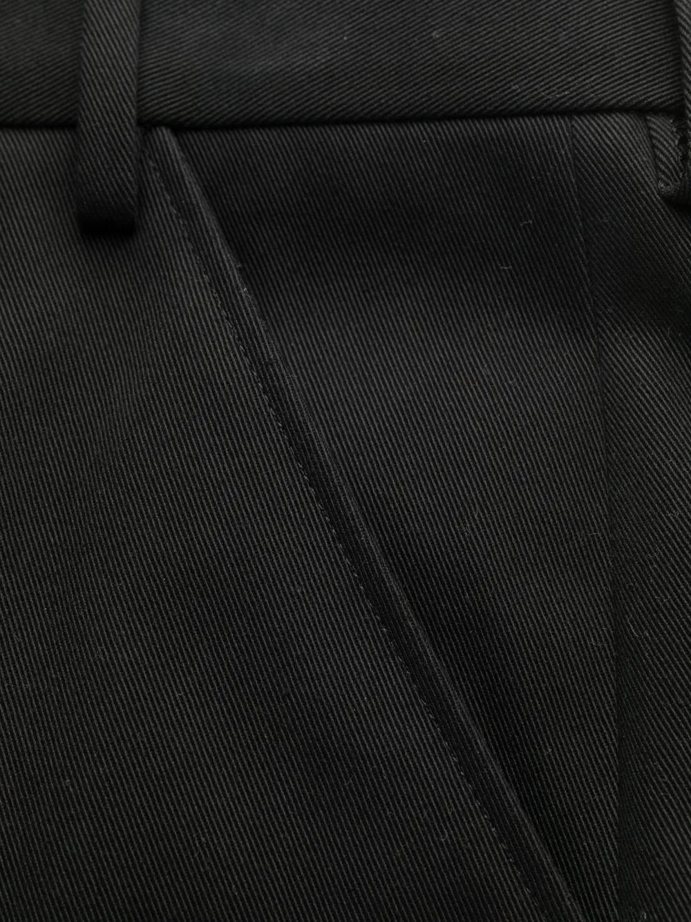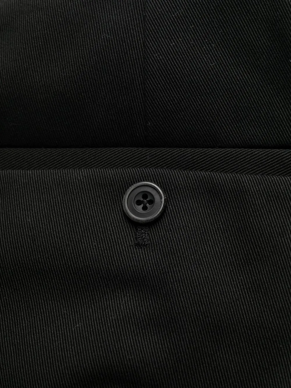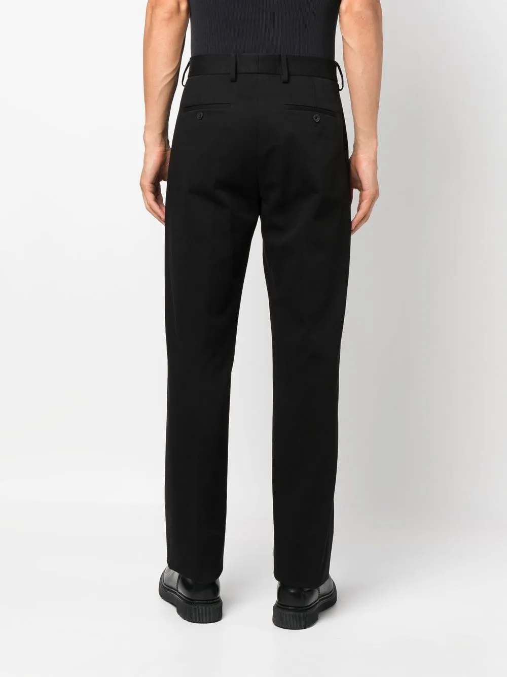 Черный, хлопок, петли для ремня, застежка на молнии и пуговице спереди, два прорезных кармана по бокам, два кармана с листочкой сзади и прямой крой.