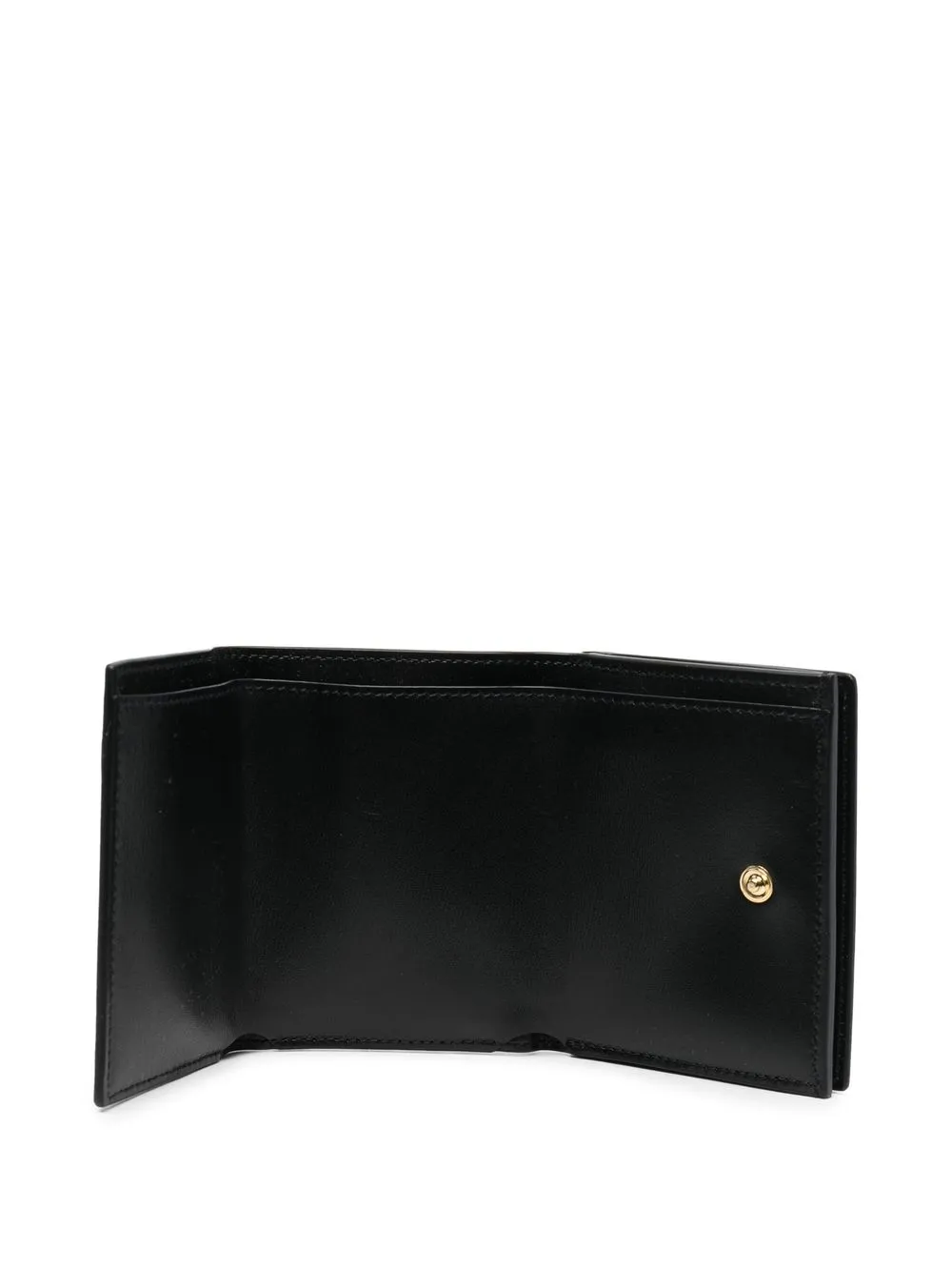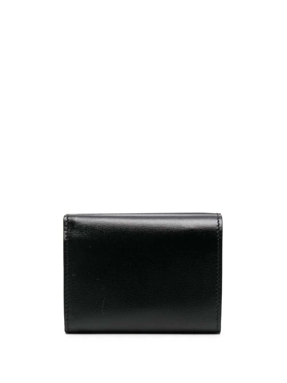 Черный, телячья кожа, зернистая текстура, три сложения, золотистый логотип и застежка на пуговицы.
